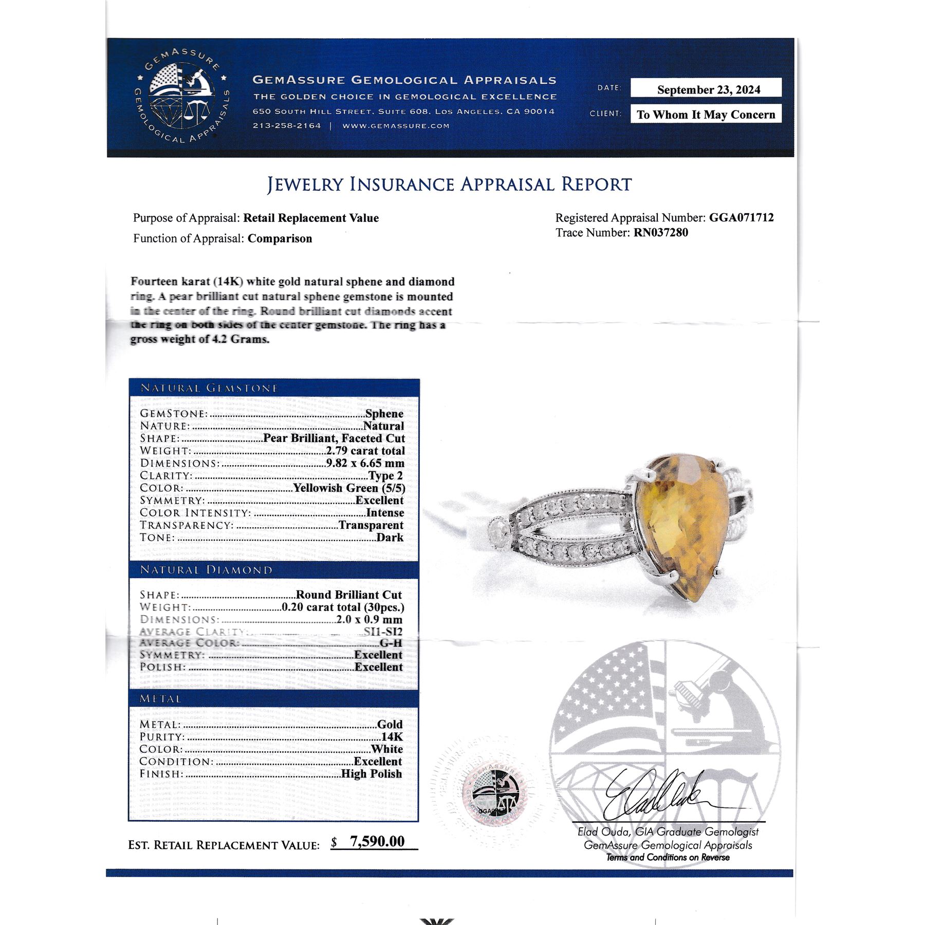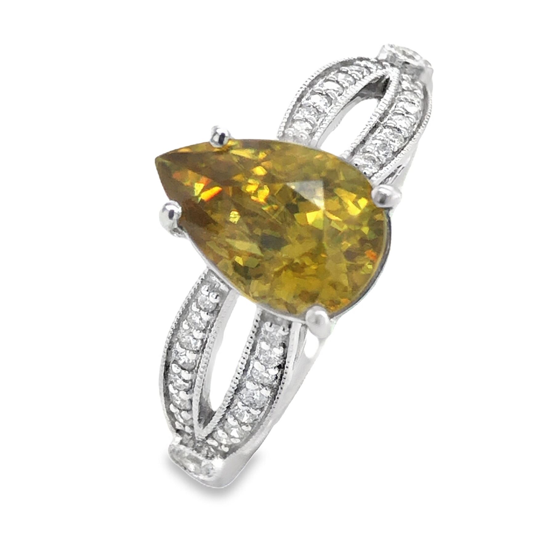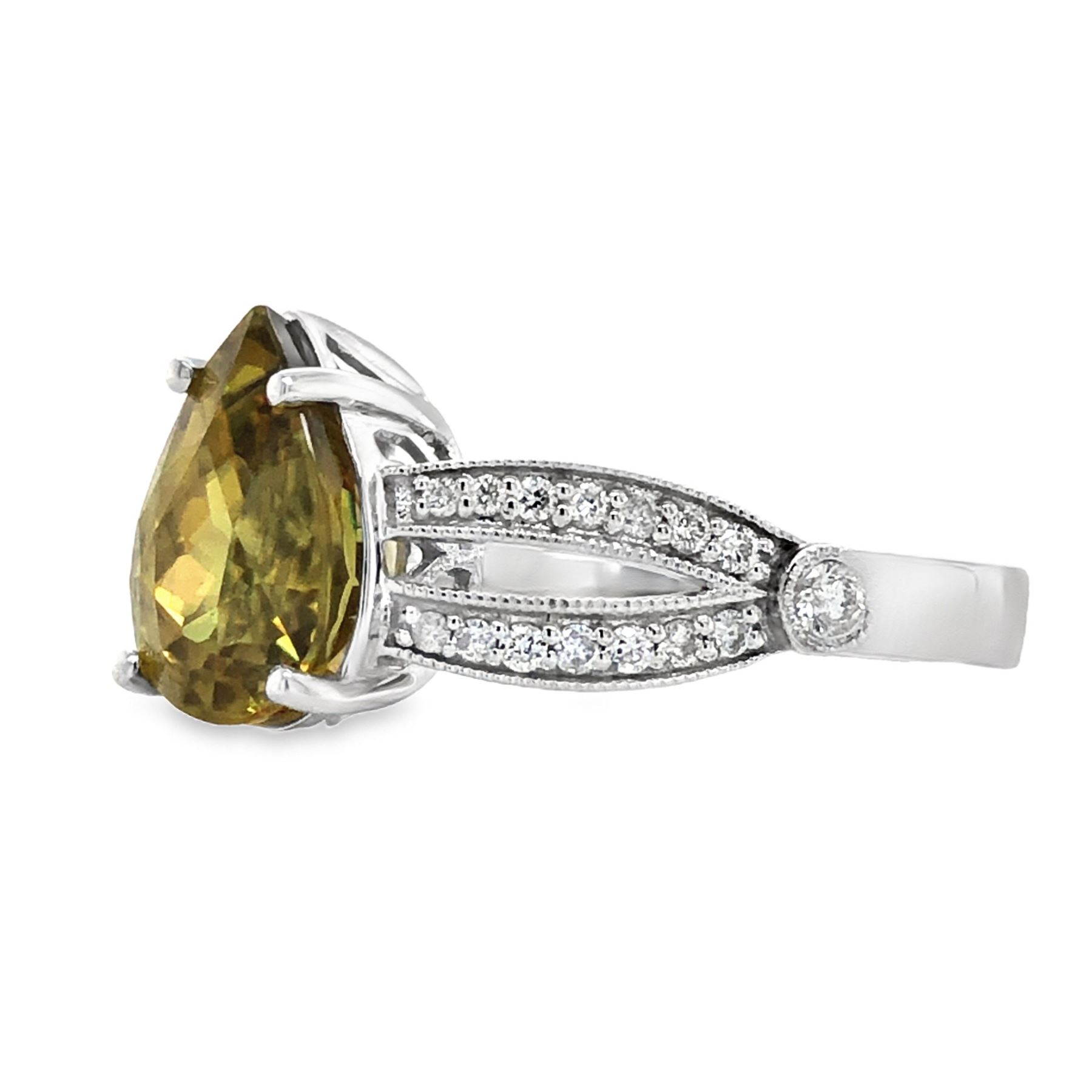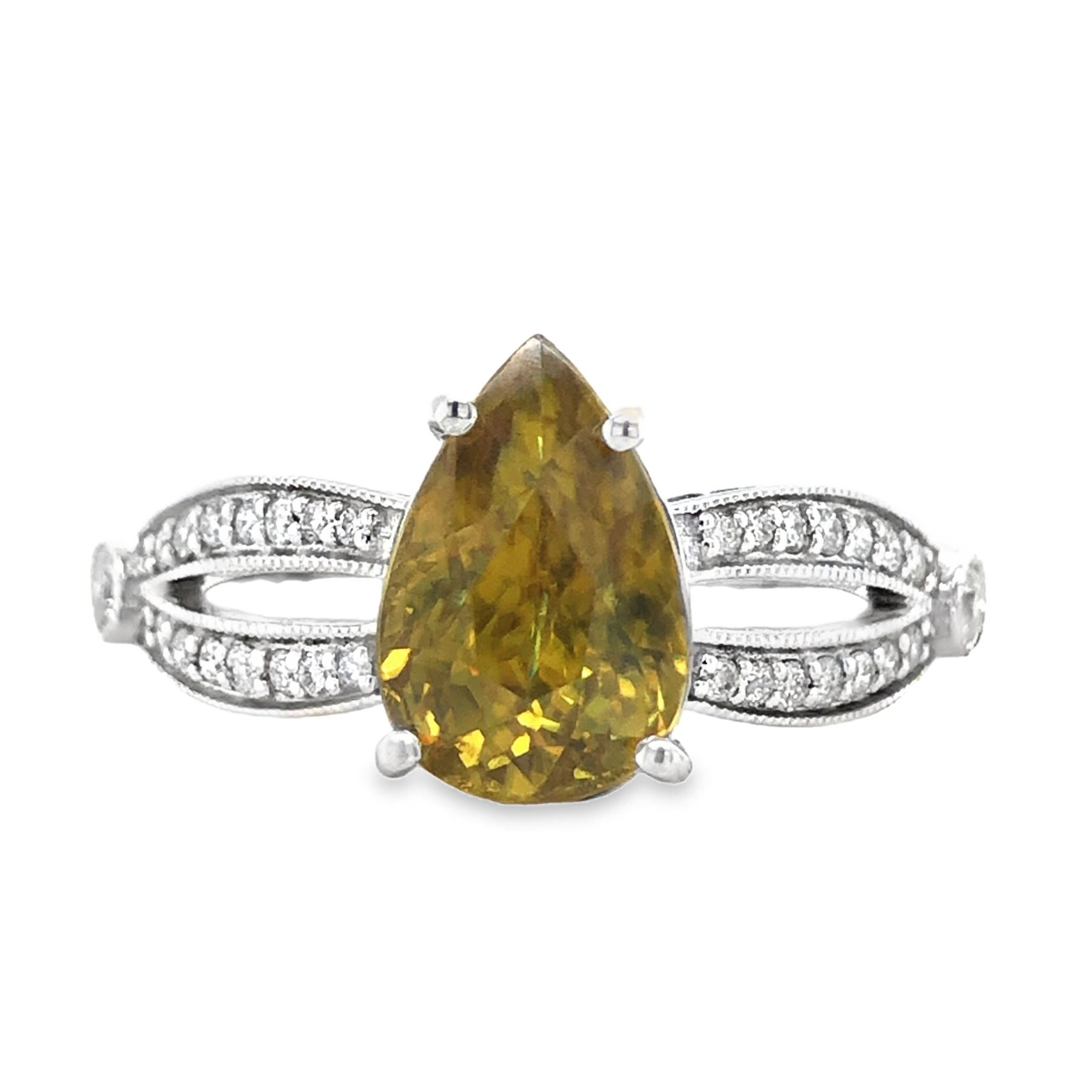 DESCRIPTION DETAIL: A pear-shaped Sphene ring with diamonds set in double shoulders.