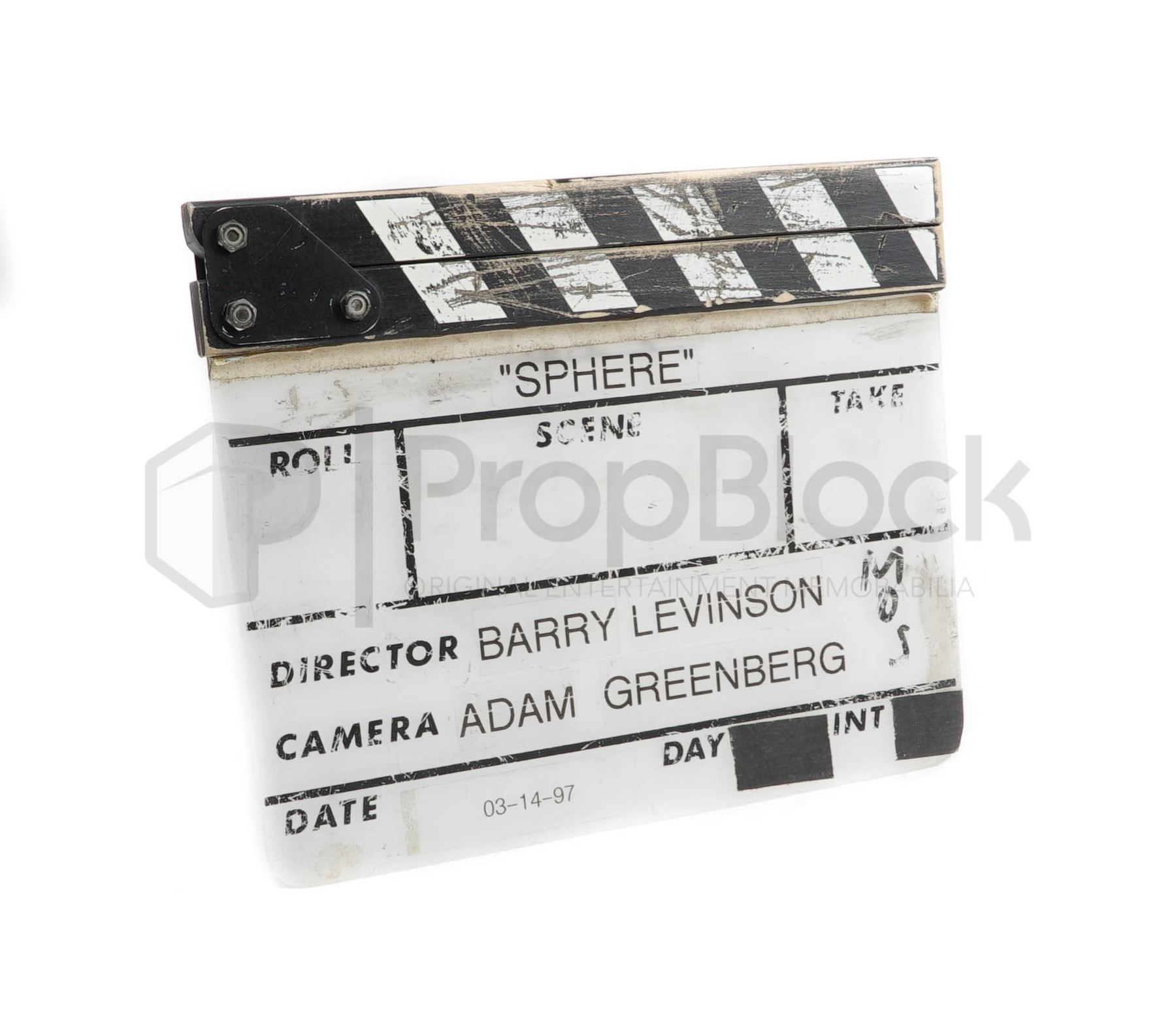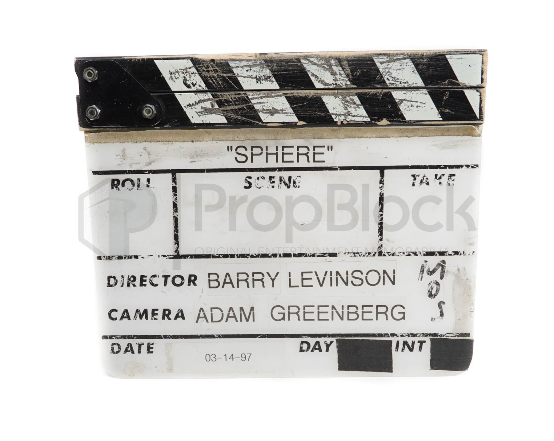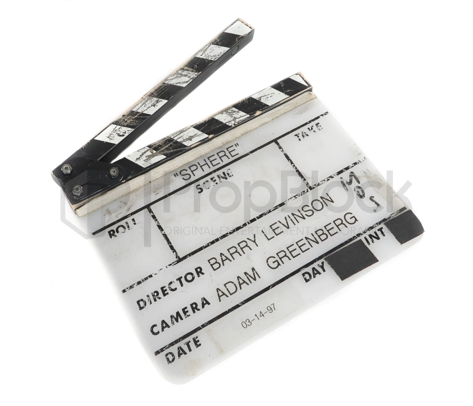 Original clapperboard used in the production of the 1998 science fiction film Sphere. A spaceship is discovered under three hundred years' worth of coral growth at the bottom of the ocean. This piece is made of white acrylic with a black and while wooden clapper on the top. The board features the films logo along with camera information written in black. This item remains in excellent, production used condition.