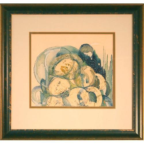 The wonderfully imaginative Canadian artist, C. Milloy, has created an abstract, but original, watercolor painting of a cluster of spheres. The spheres are light, airy, and transparent in their portrayal, almost like bubbles. They have been layered over one another in varying sizes, creating very interesting spacial relationships. The colors that Milloy has chosen to utilize are brilliant shades of blue, along with a lovely sea-foam color and a bold camel color. Milloy has also chosen to use a splatter technique that was made famous by Jackson Pollock, just not to that same extreme. The splattered paint resembles the splash of a wave, delicate and hypnotizing. In addition, these incredible spheres have been strategically placed on a rich creamy paper that absolutely matches the top mat of the piece, while the bottom mat reflects the greenish tan hues. A rare and quite unique blue oxidized wood frame that is accented with gold was chosen to outfit this truly visionary work of art. It is perfect in every sense of the word for it greatly harmonizes with the colors seen throughout the painting. This exquisite piece?s measurements are 19 ½? x 19 ¼?, which also includes the exceptional frame. The artist has also signed the painting in the lower right hand corner. This is truly a work of art that stimulates the mind and would brighten any space. For a painting of this caliber, the price is excellent.