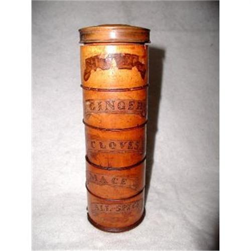 Fabulous C.1795-1830 fruitwood tole round boxes from England were all hand milled and threaded so that one box screws onto the next as well as the wooden lid to form a spice column. Each is decorated with a tole banner on the front displaying the contents. "Nutmeg" with slight wear to the name,"Cloves,
