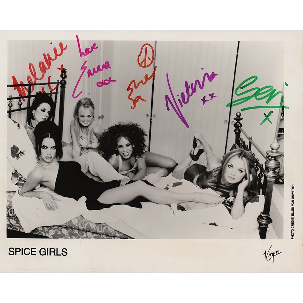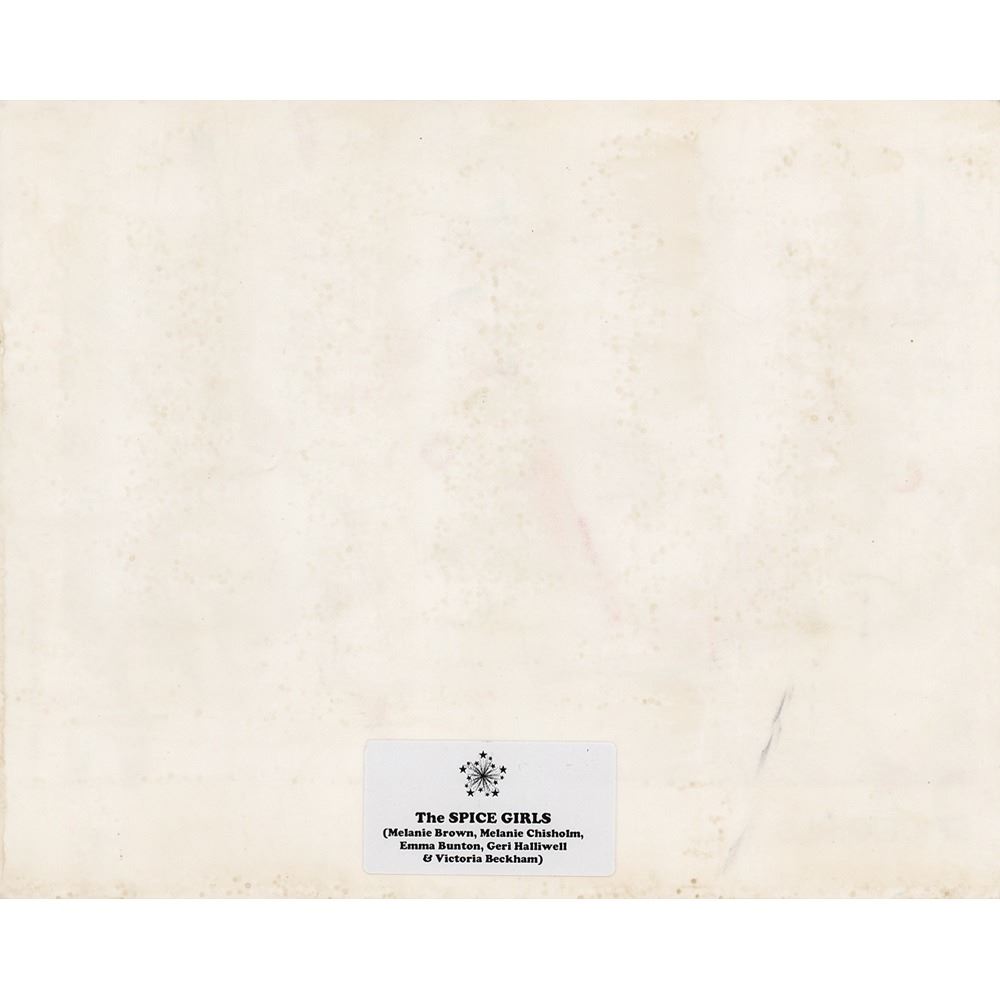 Satin-finish 10 x 8 Virgin Records publicity photo of the Spice Girls, signed in various inks by Victoria Beckham, Melanie Chisholm, Melanie Brown, Geri Halliwell, and Emma Bunton, all signing with first names only. Reverse bears a label marked "The Spice Girls," which lists all of their names. In fine condition.