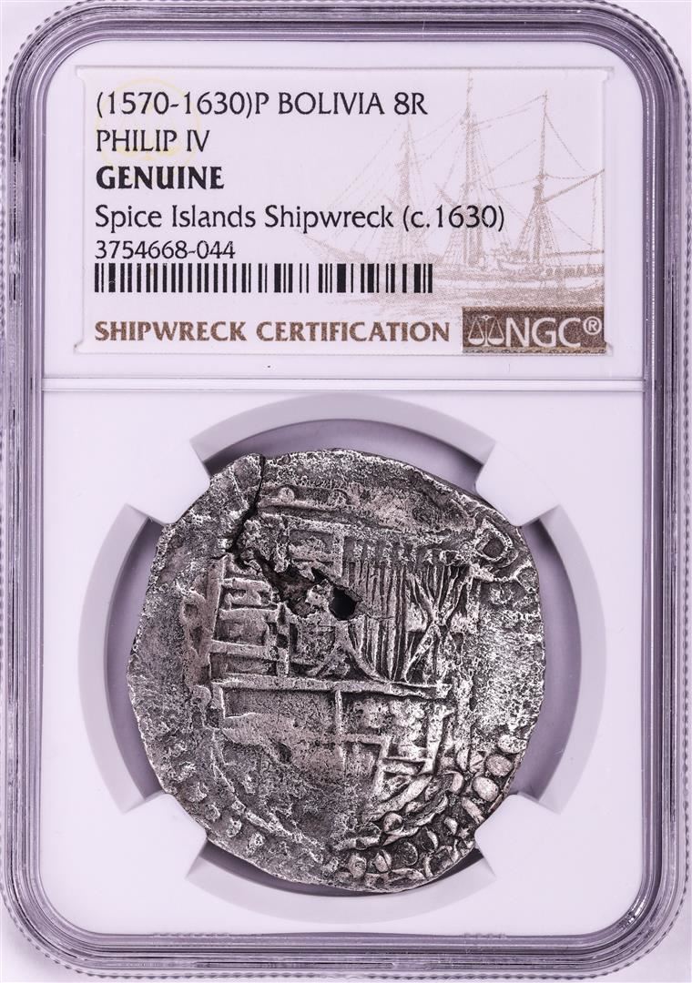 One Spice Islands Shipwreck (1570-30)P Bolivia 8 Reales Philip IV Silver Coin NGC Genuine. NGC Certified.