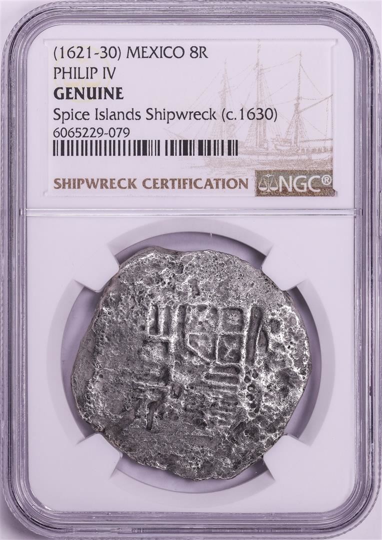One Spice Islands Shipwreck (1621-30)MO Mexico 8 Reales Philip IV Silver Coin NGC Genuine. NGC Certified.