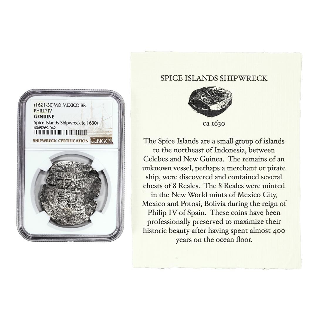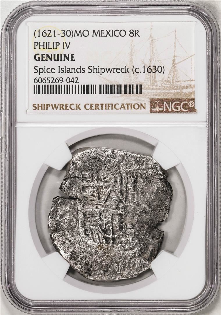 One Spice Islands Shipwreck (1621-30)MO Mexico 8 Reales Philip IV Silver Coin NGC Genuine. NGC Certified.