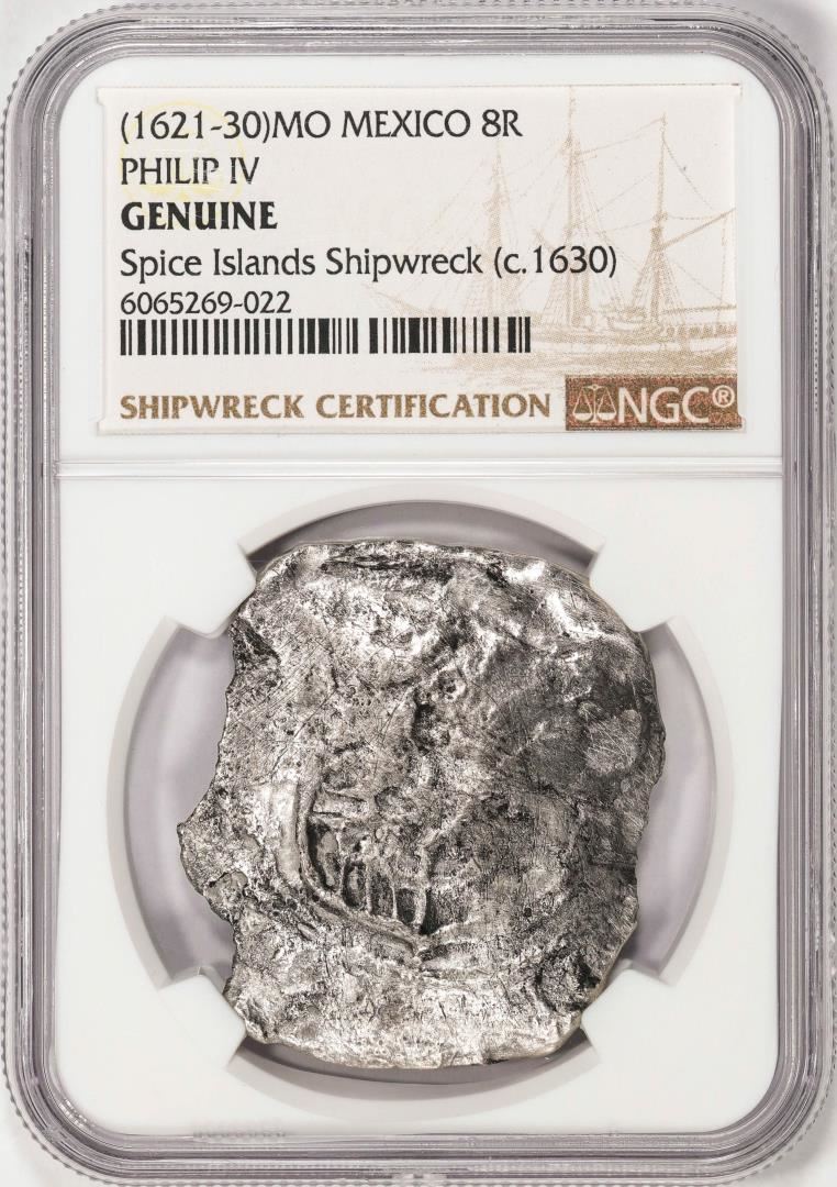 One Spice Islands Shipwreck (1621-30)MO Mexico 8 Reales Philip IV Silver Coin NGC Genuine. NGC Certified.