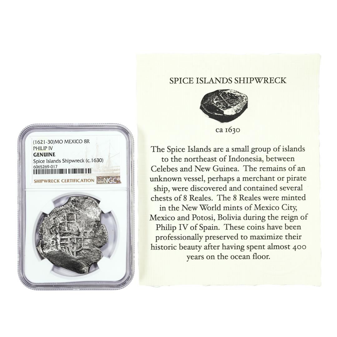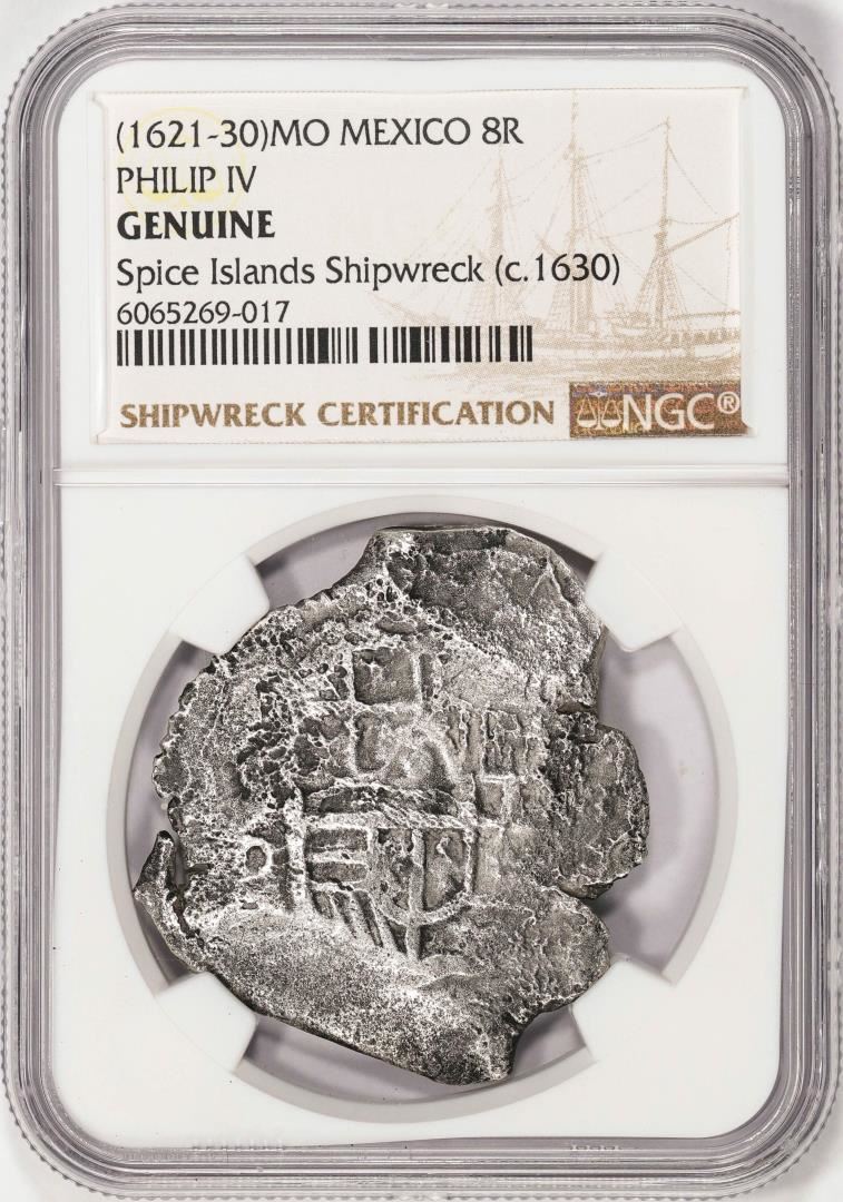 One Spice Islands Shipwreck (1621-30)MO Mexico 8 Reales Philip IV Silver Coin NGC Genuine. NGC Certified.