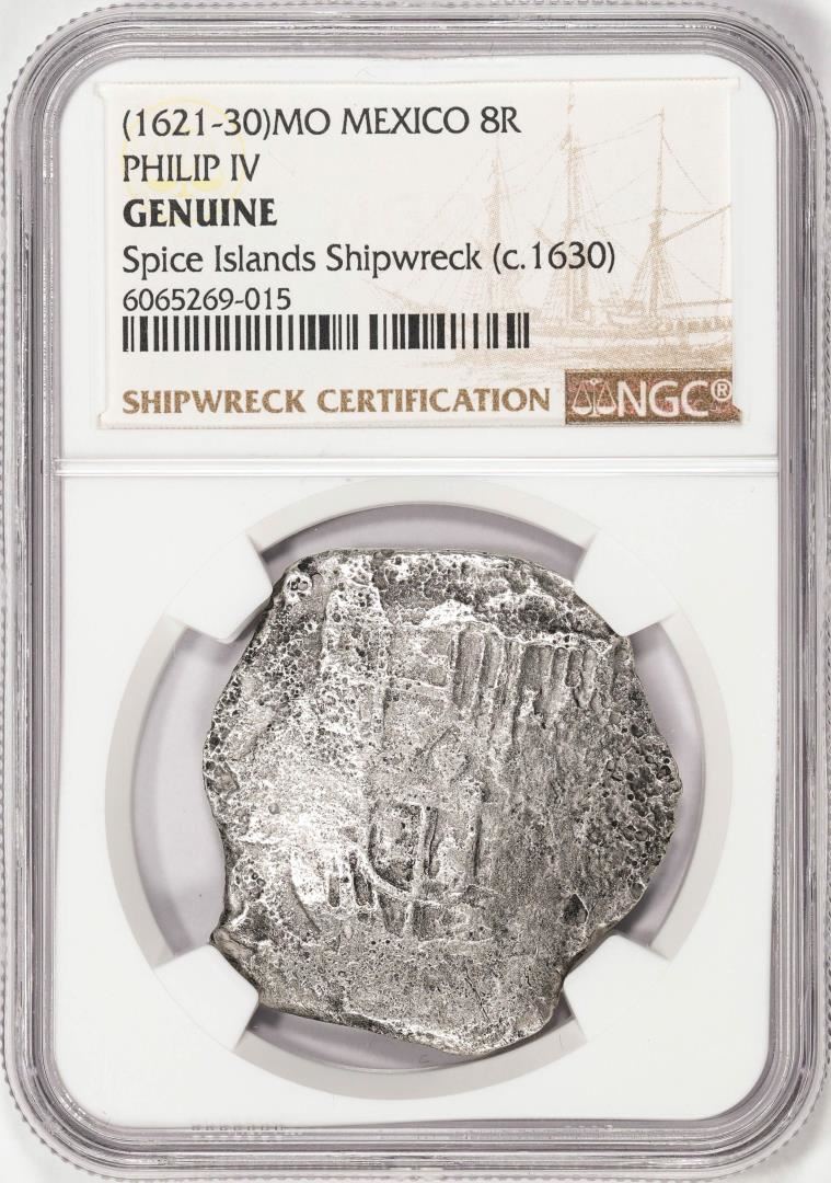 One Spice Islands Shipwreck (1621-30)MO Mexico 8 Reales Philip IV Silver Coin NGC Genuine. NGC Certified.
