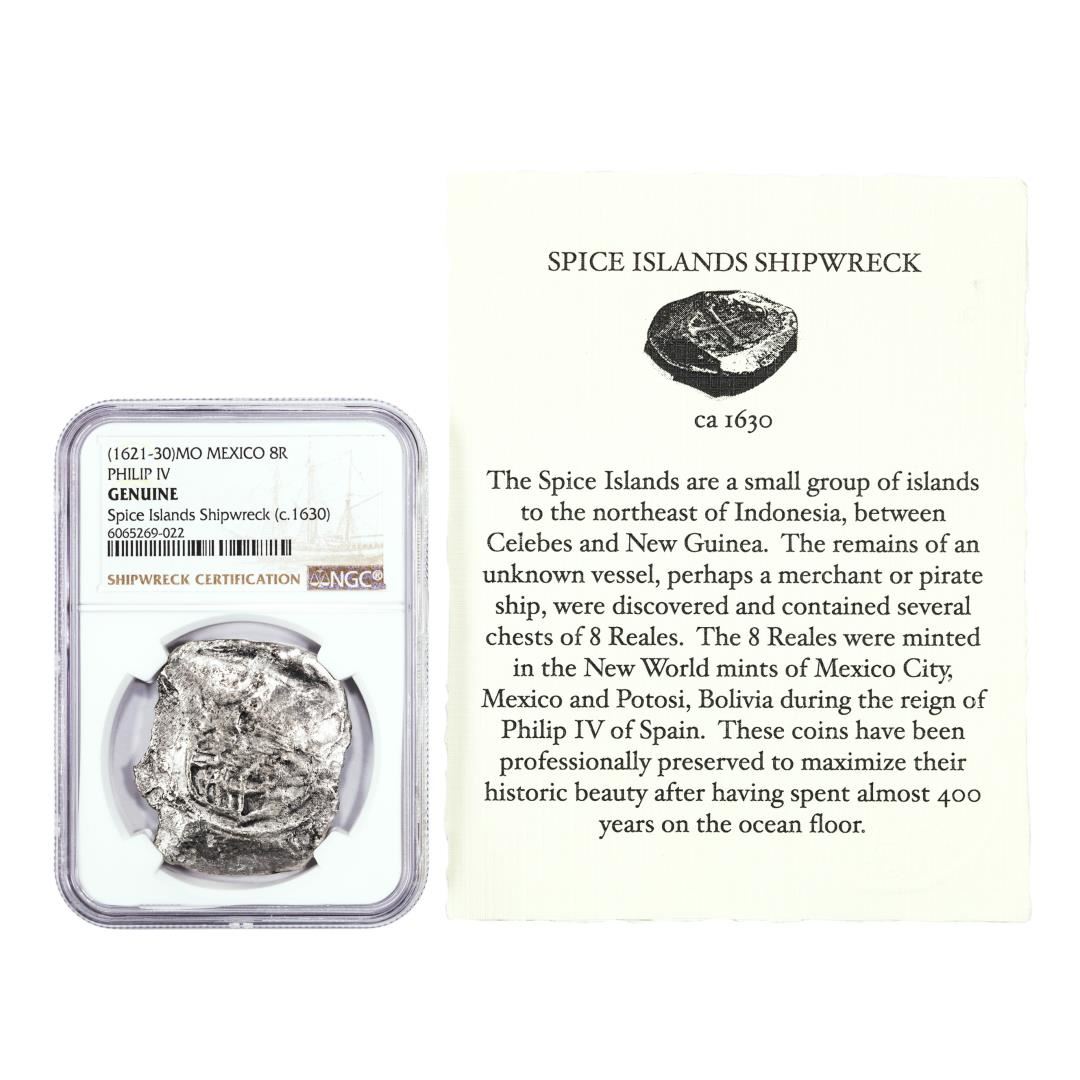 One Spice Islands Shipwreck (1621-30)MO Mexico 8 Reales Philip IV Silver Coin NGC Genuine. NGC Certified.