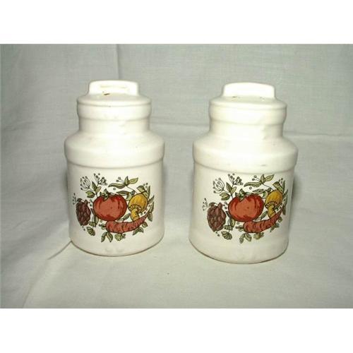 Stoneware salt and pepper set, matching the corningware spice of life pattern. Measures 3 3/4 inches tall. Excellent condition with no nicks, chips or cracks.