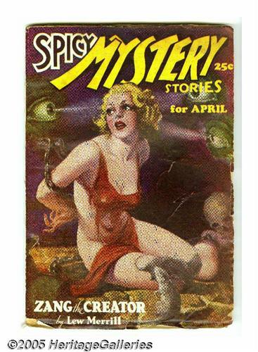 <B>Spicy Mystery April 1936 (V2#6) (Culture, 1936) Condition: VG+.</B></I> Classic cover features a bound, nearly-nude blonde being menaced by rats and giant floating eyeballs. H. L. Parkhurst gets credit for the cover art. The featured story in this issue is "Zang the Creator" by Lew Merrill. There are many spicy interior illustrations. Condition is typical for the grade; no major defects, just an accumulation of general surface and edge wear. Cover paper is white, interior pages are cream. The Ultimate Guide to the Pulps VG value = $250.