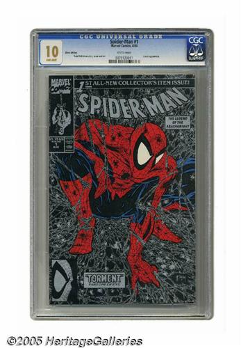 <B>Spider-Man #1 Silver Edition (Marvel, 1990) CGC MT 10.0 White pages.</B></I> Here's a Gem Mint copy of one of the most popular (and one of the bestselling) comic issues of the Modern Age. This copy's from the silver, direct sale-only (unbagged) edition. The story, cover, and art are by Todd McFarlane. Overstreet 2005 NM- 9.2 value = $8. CGC census 1/05 (for the Silver Edition): 25 in 10.0. <I>From the collection of Chris Bell.</B></I>