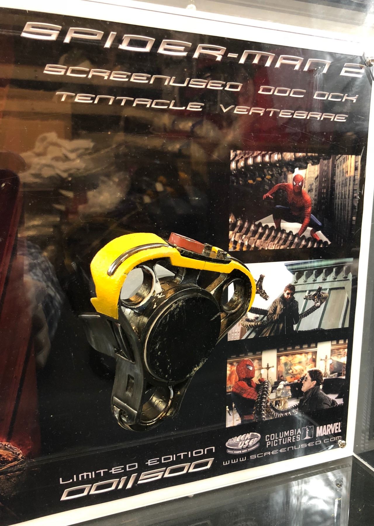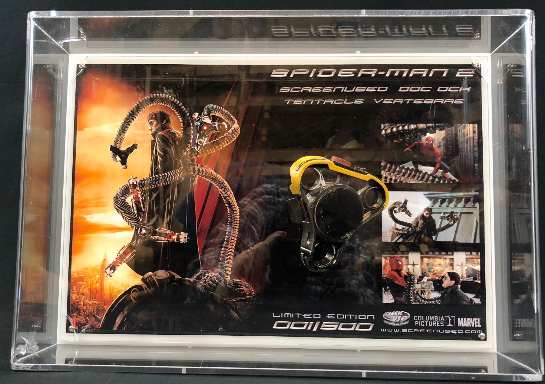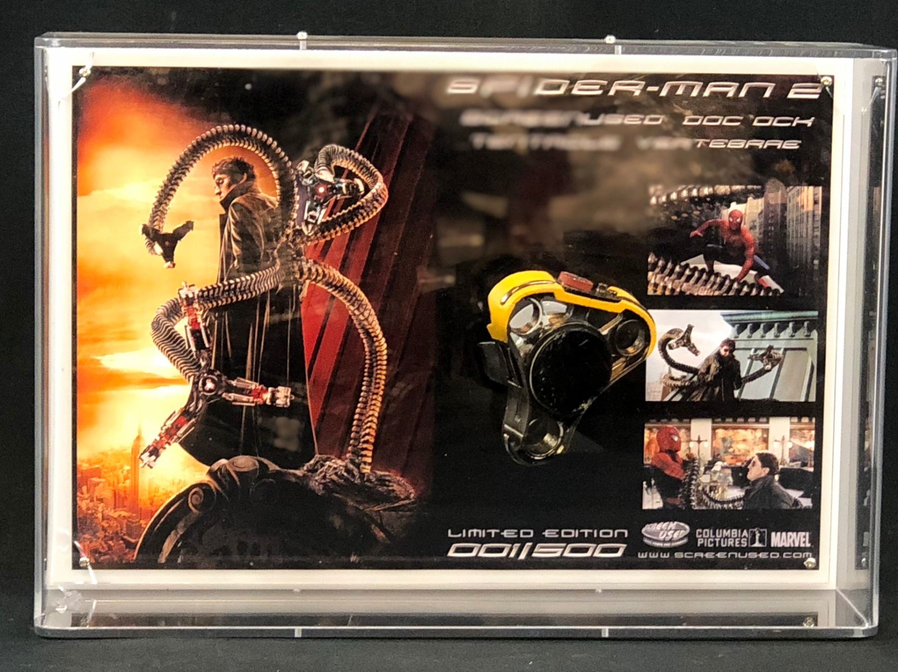Original screen used Ock tentacle vertebrae used by Alfred Molina as "Doc Ock" used in the production of the Sam Raimi directed superhero film "Spider-Man 2 (2004), where Peter Parker is beset with troubles in his failing personal life as he battles a brilliant scientist named Doctor Otto Octavius. Tobey Maguire, Kirsten Dunst, James Franco, Rosemary Harris, and J. K. Simmons reprise their respective roles as Peter Parker / Spider-Man, Mary Jane Watson, Harry Osborn, Aunt May, and J. Jonah Jameson, while Alfred Molina and Donna Murphy join the cast as Otto Octavius / Doctor Octopus and Rosalie Octavius.
