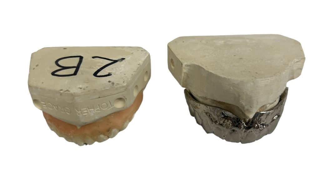 Original teeth prosthetics (finished and wearable) collection for 'Venom', played by Topher Grace in the Sam Raimi directed superhero film 'Spider-Man 3' (2007), where, a strange black entity from another world bonds with Peter Parker and causes inner turmoil as he contends with new villains, temptations, and revenge.