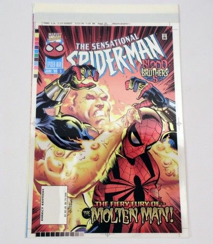 From one of the most spectacular covers ever to grace a "Spider-Man" Comic Book Cover, this is Spider-Man #5 featuring the "Fiery Fury of the Molten man". The gold sheen of Molten Man against Spidey's red outfit is eye-popping. This is the 4-Color proof cover from this issue. In most cases, proofs are destroyed after printing, which makes this a true find. Has all four color separation acetates. 7.5"x12".