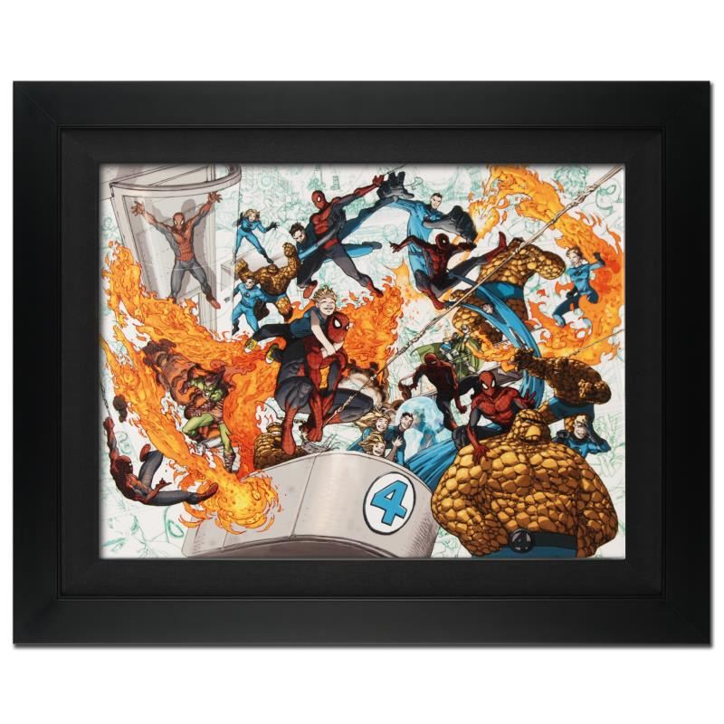 A piece of comic book history, this limited edition, from original art by Mario Alberti, depicts an action-packed scene with Spider-Man and the Fantastic Four. Italian artist Mario Alberti is particularly known for his covered work for both DC and Marvel comics. "Spider-Man/Fantastic Four #4" is a limited edition giclee on canvas by Mario Alberti presented by Marvel Comics, hand signed by the great Stan Lee and numbered out of only 10! This piece has been custom framed and ready to hang. Includes Certificate of Authenticity! Measure approx. 31" x 25" (with frame); 24" x 18" (image).