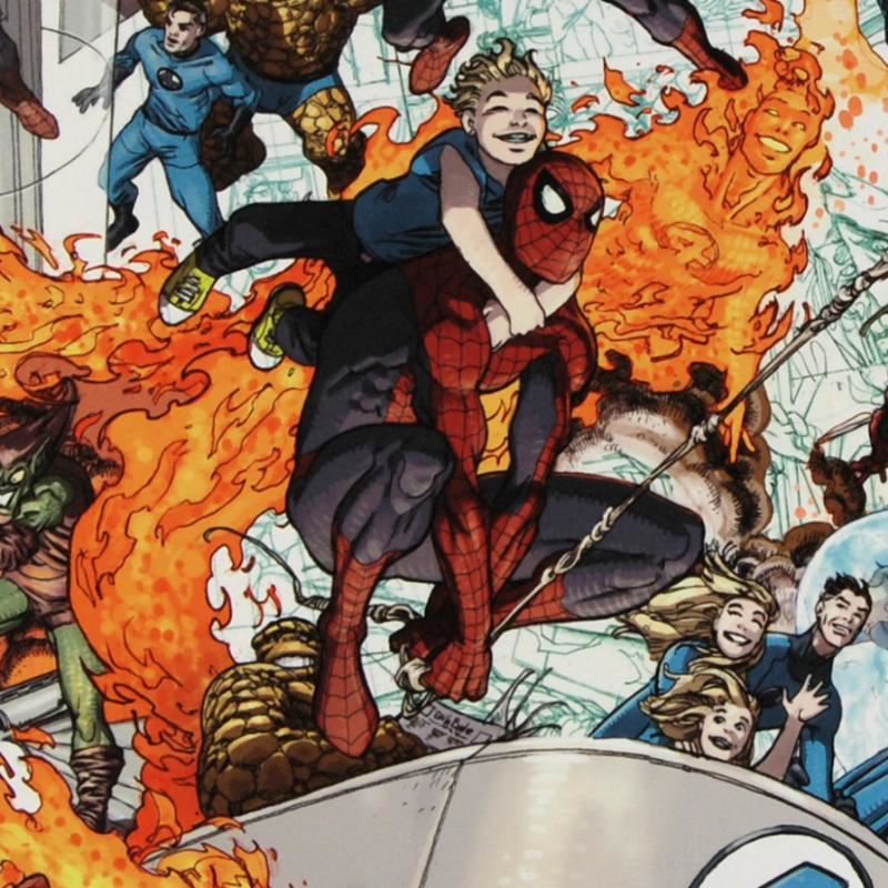 A piece of comic book history, this limited edition, from original art by Mario Alberti, depicts an action-packed scene with Spider-Man and the Fantastic Four. Italian artist Mario Alberti is particularly known for his covered work for both DC and Marvel comics. "Spider-Man/Fantastic Four #4" is a limited edition giclee on canvas by Mario Alberti presented by Marvel Comics, hand signed by the great Stan Lee and numbered out of only 10! This piece has been custom framed and ready to hang. Includes Certificate of Authenticity! Measure approx. 31" x 25" (with frame); 24" x 18" (image).