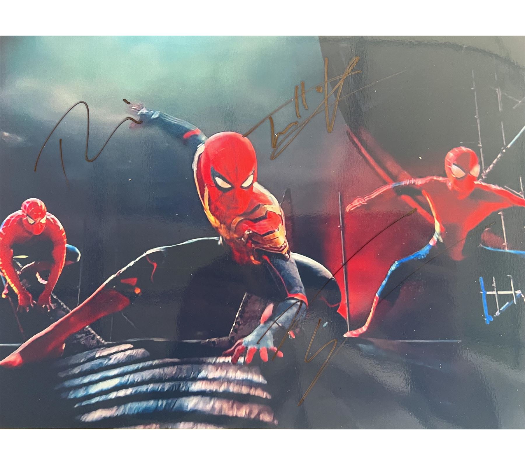 Spider-Man No Way Home cast signed photo autographed by Tom Holland, James Garfield and Tobey Maguire. 8x10 inches