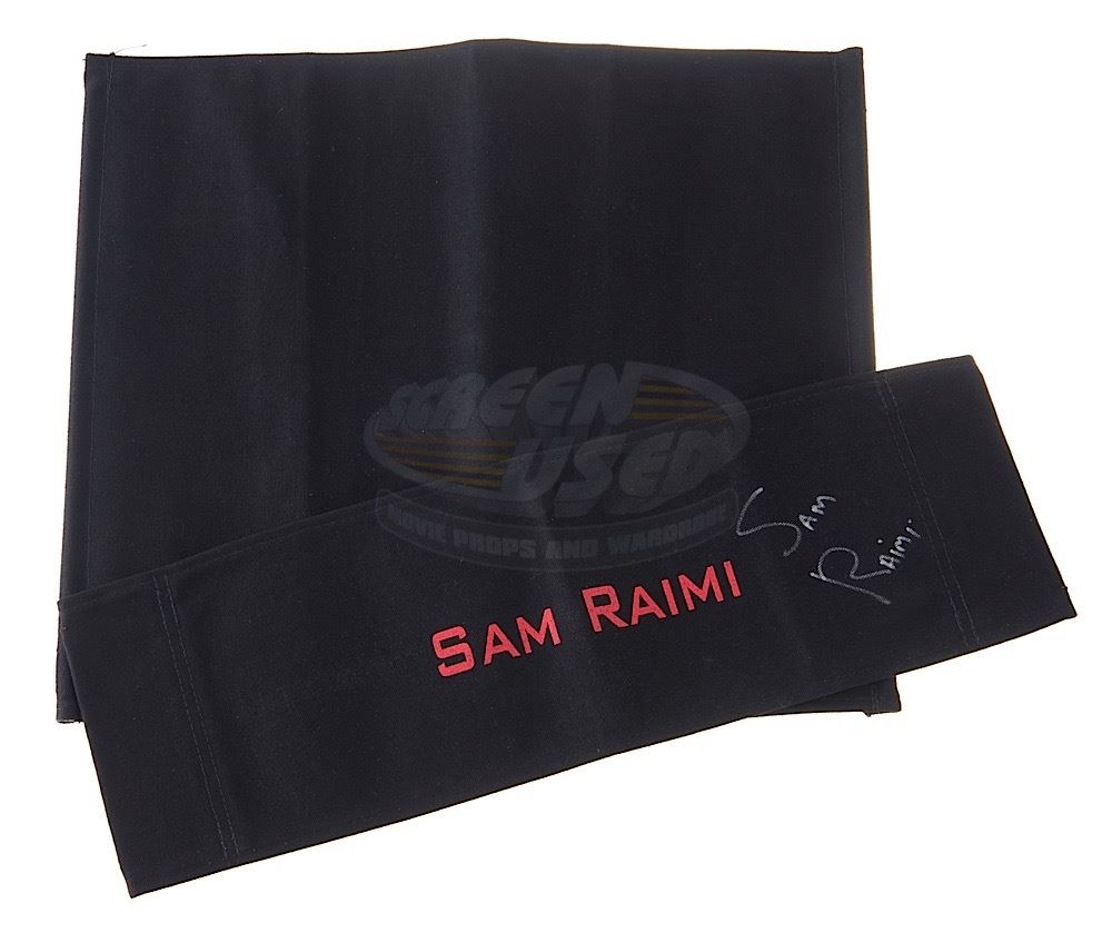 (Columbia Pictures, 2002) This chair back and seat were custom-made by the production for use by Sam Raimi during filming. The chair back features his name on one side and the film's logo on the other. The chair back has been autographed by Sam Raimi in silver.