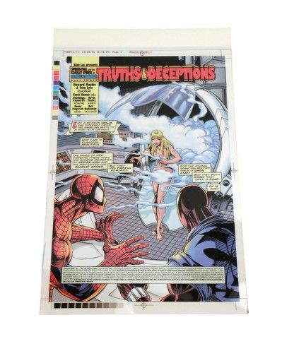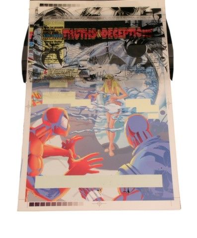 Spider-Man & Scarlet Spider Comic Book Cover 4-Color Proofs - A rare cover art by Howard Mackie & Tom Lyle of the Stan Lee presents "Spider-Man and the Scarlet Spider in Smoke & Mirrors Part 3 - Truth & Deceptions". This is the original 4-Color Marvel Comic proofs for the cover printing of the edition. These proofs are usually destroyed shortly after printing. However a few were saved, and are extremely valuable. A very sensuous and unusual cover design, it features four multi-layered acetates. Very rare and very desirable production art. One-of-a-kind. Approx 7.5x12.5".