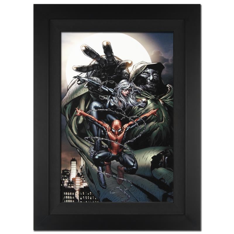 A piece of comic book history, this limited edition, from original art by David Finch, depicts Black Cat, Dr. Doom, and Spider-Man. In 2003, Finch came to Marvel Comics for a year-long arc on Ultimate X-Men, after which he began work on The Avengers and thereafter The New Avengers. He has also worked on such titles as Captain America, Spider-Man and the Hulk. "Spider-Man Unlimited #14" is an extremely limited edition giclee on canvas by David Finch presented by Marvel Comics, hand signed by the Great Stan Lee (1922-2018) and numbered out of only 4! This piece comes custom framed and ready to hang. Includes Certificate of Authenticity! Measures approx. 29" x 40" (with frame), 22" x 33" (image).