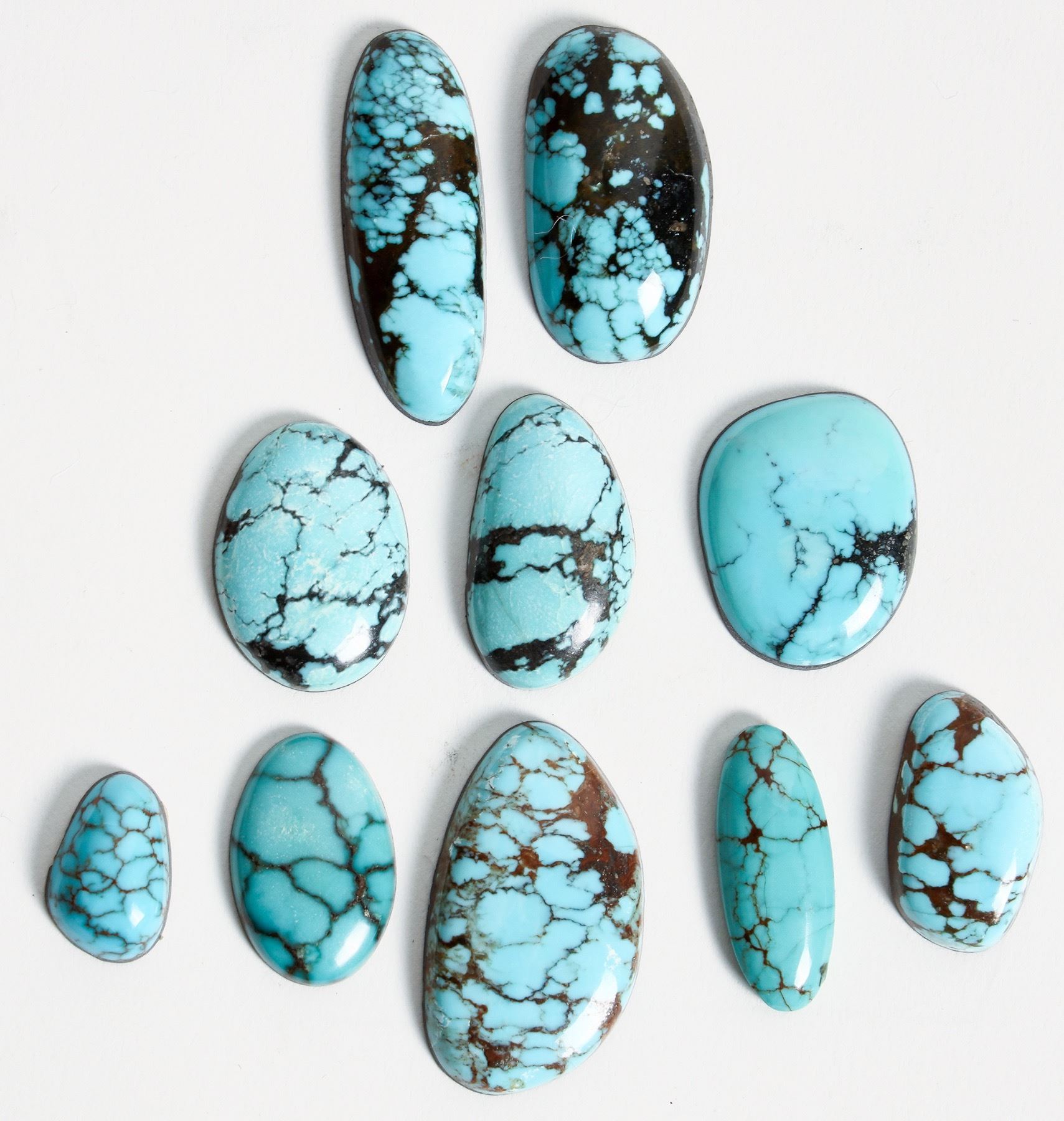 Ten absolutely choice spiderweb turquoise from at least two locations, maybe three. Generally about 3/4-1". most backed. Fank Lewton Collection. We have placed many stones in the "Minerals" section as well as this jewelry section, so we hope you get a chance to look through that section too for your favorite turquoise stones! [] [] [] [] []