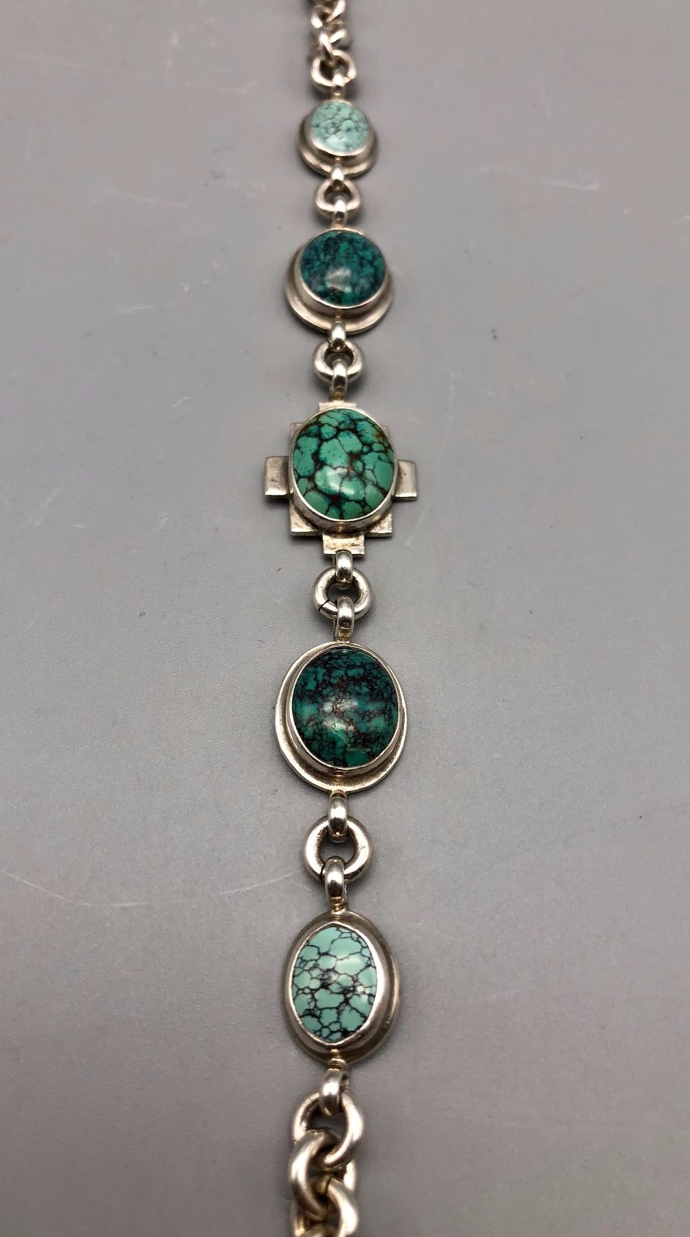 Maker: Unknown maker. Approx. Age: Fairly modern. Size: Fits a 7 5/8” wrist and is 5/8” at it’s widest point and weighs 20.1 g. Additional Info: Beautiful spiderweb turquoise set in a sterling silver. Condition: Good, normal wear expected. Please look closely at the pictures - they are an important part of our description. Shipping: There will be a $5 handling / packaging fee for shipping this lot. The actual cost of postage will be added on top of that.