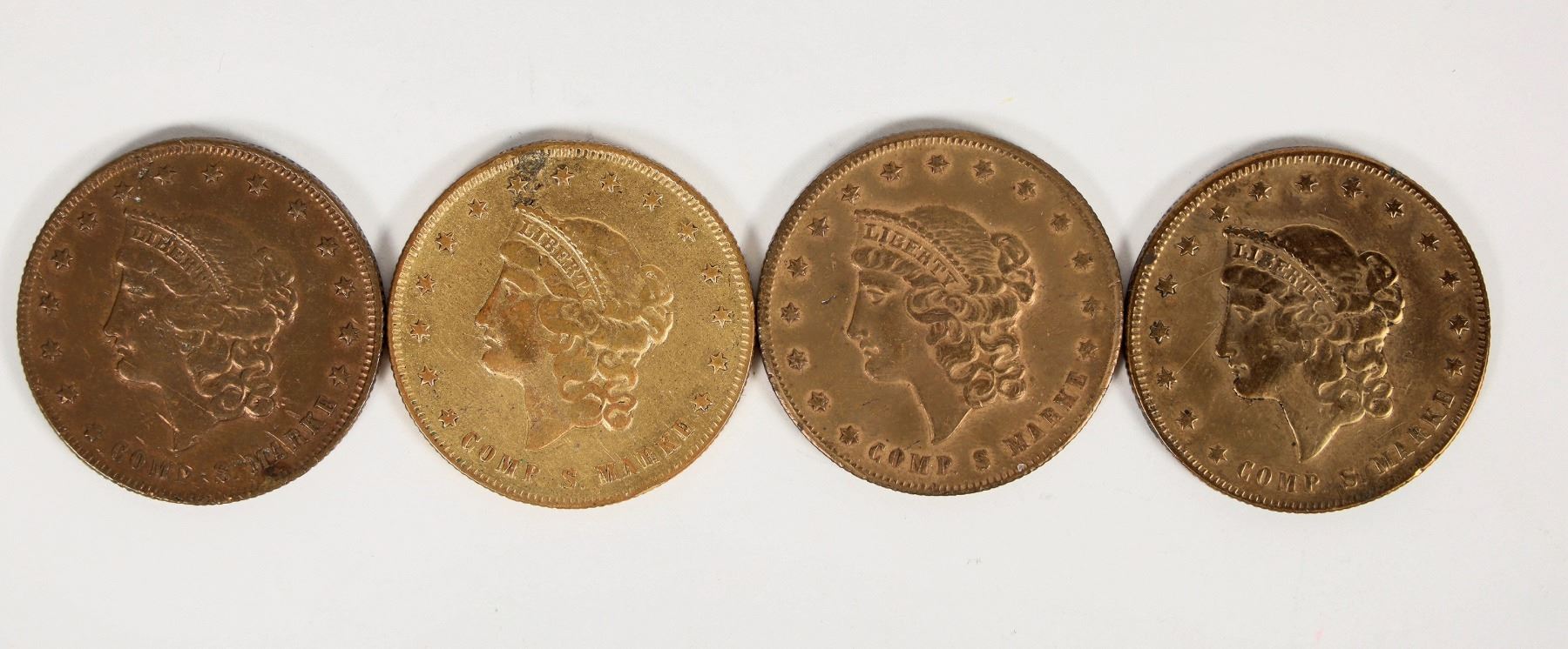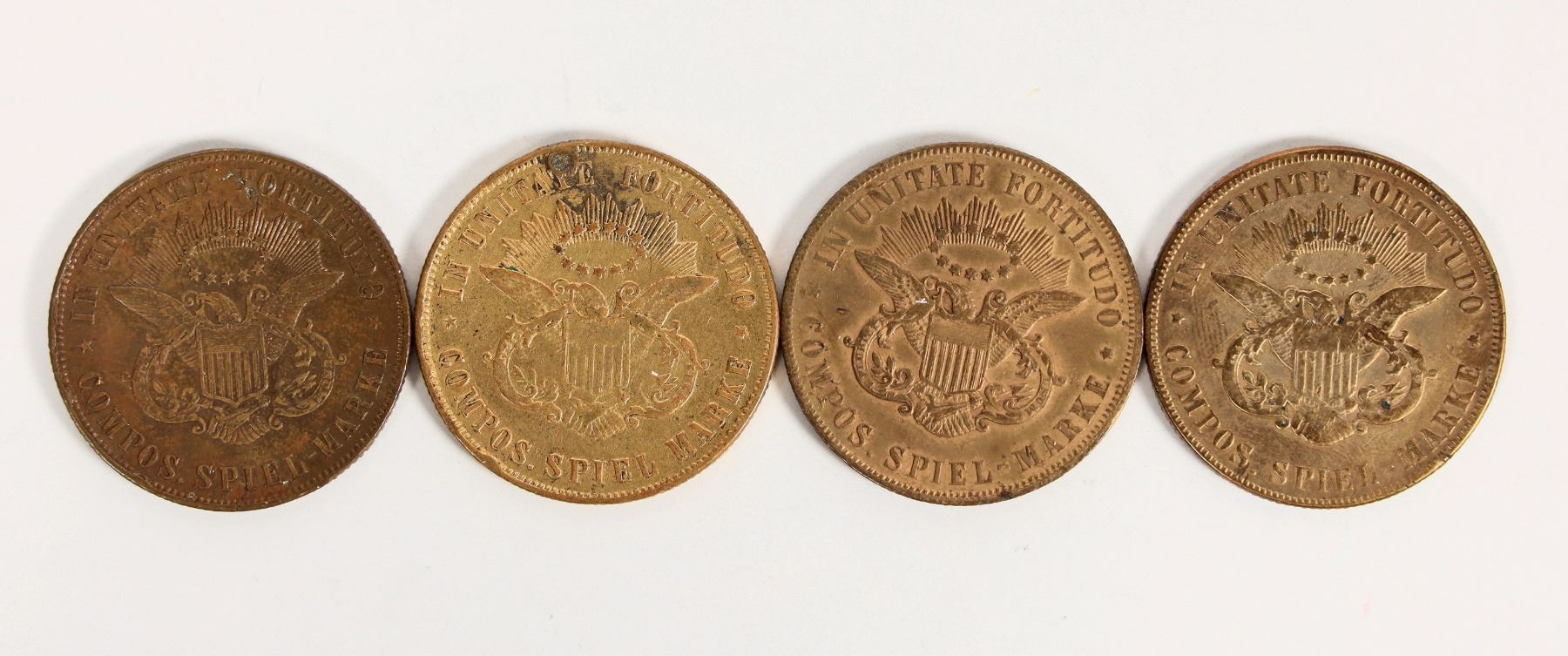 Four brass spiel mark counters designed after US $20 gold pieces. Each one is clearly marked SPIEL MARKE literally meaning game marker.