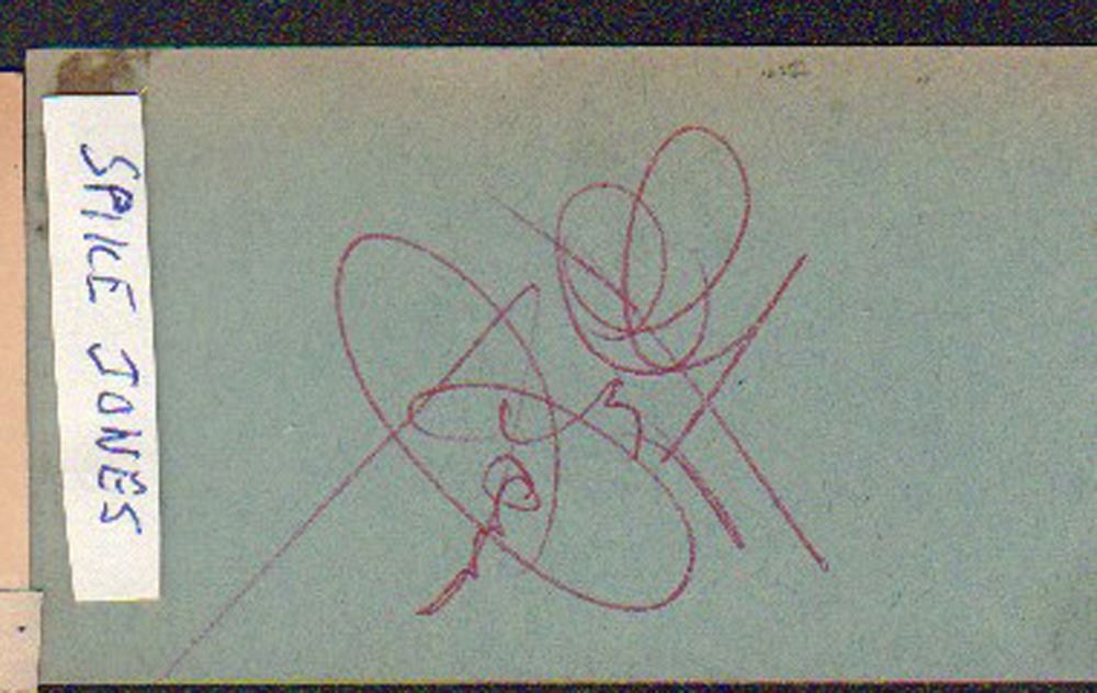 Two inch by four inch rare Ontra Cafeteria parking stub signed by Spike Jones. The Ontra Cafeteria was one of the hot spots of Beverly Hills in the 1950s. All items come with a certificate of authenticity good for the life of the piece.