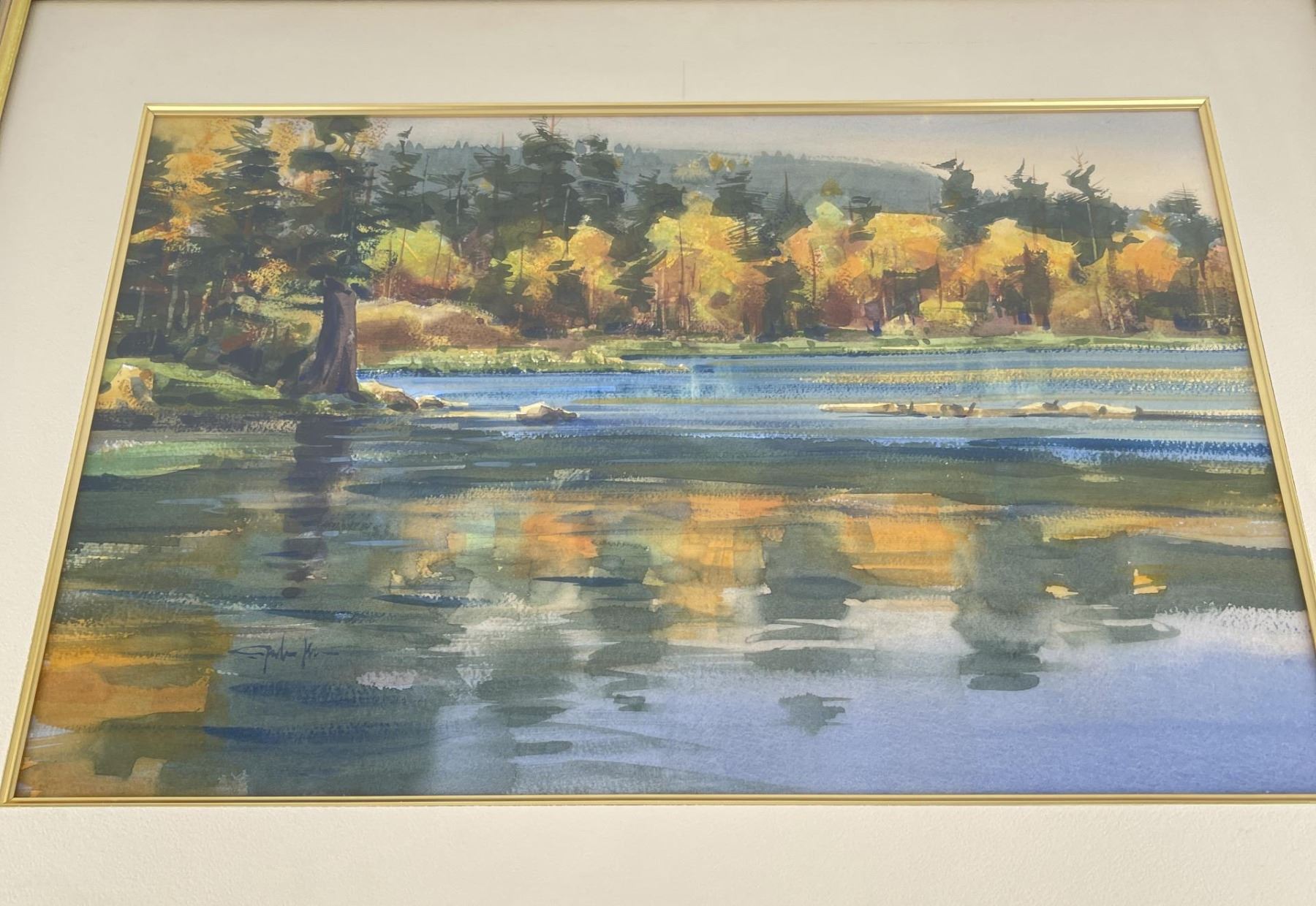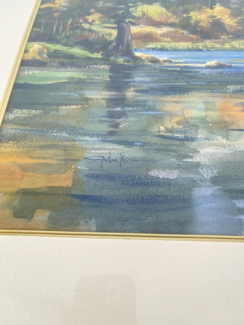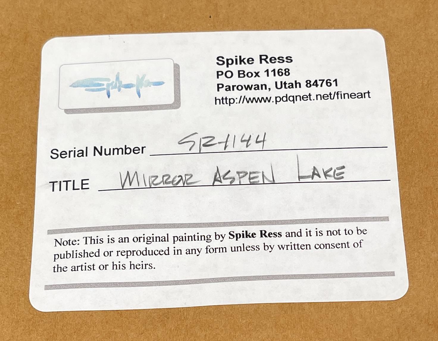 Title is Mirror Aspen Lake. 24 1/2" by 31 5/8" framed. Spike Ress (Born 1948) is active/lives in Utah. Spike Ress is known for Southwestern landscape. A resident of Parowan, Utah, he travels to the many national parks within a day's drive from his studio. He was born on Long Island, New York, but spent his childhood in Roswell, New Mexico where he had an apprenticeship with a sign company. Then he became an art director for a Las Vegas, Nevada firm. But tiring of illustration, he turned to fine art, taking much of his early inspiration from Taos, New Mexico, where he lived for several years until 1987 when he moved to Utah.