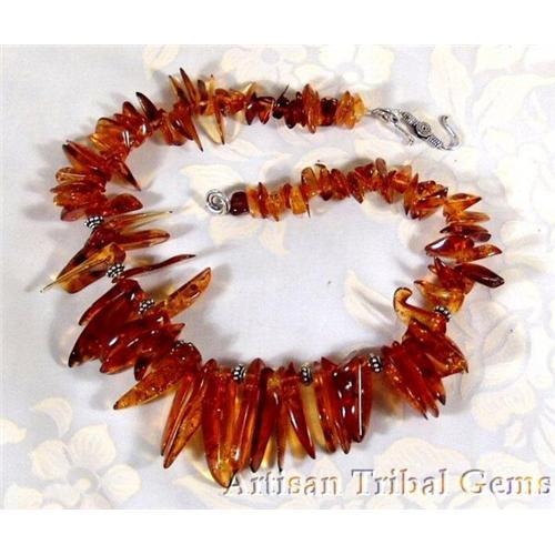 This choker is not a traditional Baltic amber necklace but an astonishing collection of enormous amber spikes complimented with tribal sterling silver. The center spikes measure up to 39mm. (25mm=1") The gram weight is an incredible 59 and Vera has finished this necklace to perfection with a bold 28mm sterling silver 's' hook not the traditional plastic screw closure. Classy and sure to draw attention for those that want the BEST. The necklace has a length of 16.75". A creation I am sure you would be proud to give or receive!