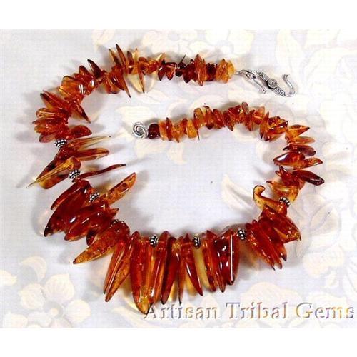 This choker is not a traditional Baltic amber necklace but an astonishing collection of enormous amber spikes complimented with tribal sterling silver. The center spikes measure up to 39mm. (25mm=1") The gram weight is an incredible 59 and Vera has finished this necklace to perfection with a bold 28mm sterling silver 's' hook not the traditional plastic screw closure. Classy and sure to draw attention for those that want the BEST. The necklace has a length of 16.75". A creation I am sure you would be proud to give or receive!