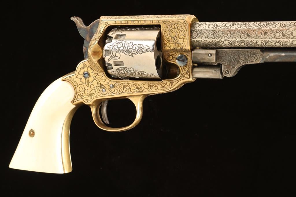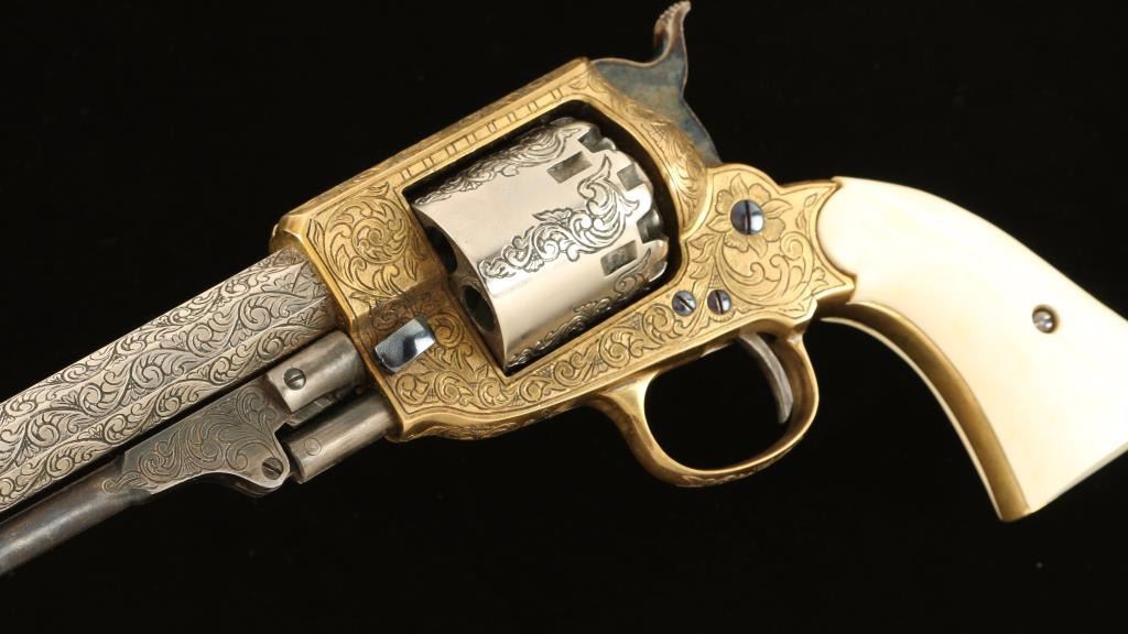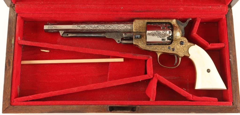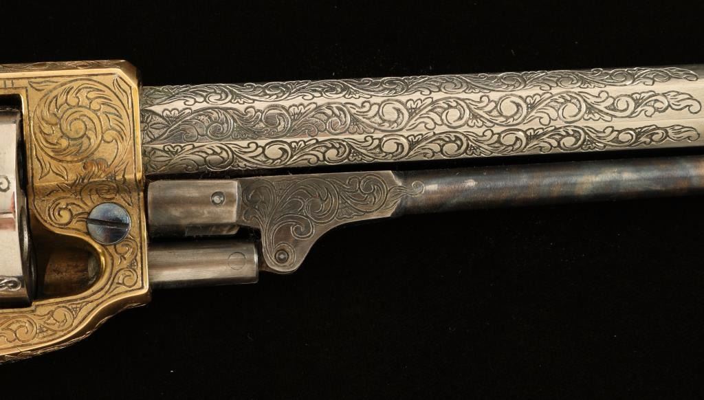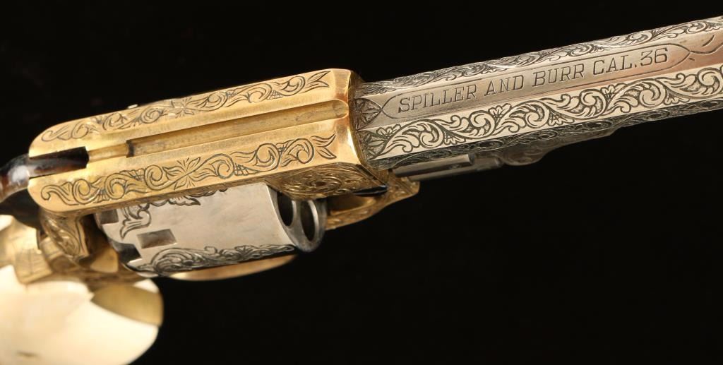 Engraved modern reproduction of the scarce Spiller & Burr confederate single action percussion revolver in .36 caliber. Features full floral engraving by Don Makarov(signed under grips), Ivory grips by C. M. Bates(singed on back), 7" nickel plated octagonal barrel, cone front sight, notched rear sight, loading lever, non-fluted nickel plated six shot cylinder, case hardened hammer with checkered spur and brass frame. Includes a partitioned wood case with red velvet lining and components for a lock. Revolvers exhibits 95% of it's nickel finish with few losses and it's case colors are vivid. Action is smooth, bore is excellent and grips are fine with few small hairline cracks. Condition is near excellent. ***Antique Firearm***