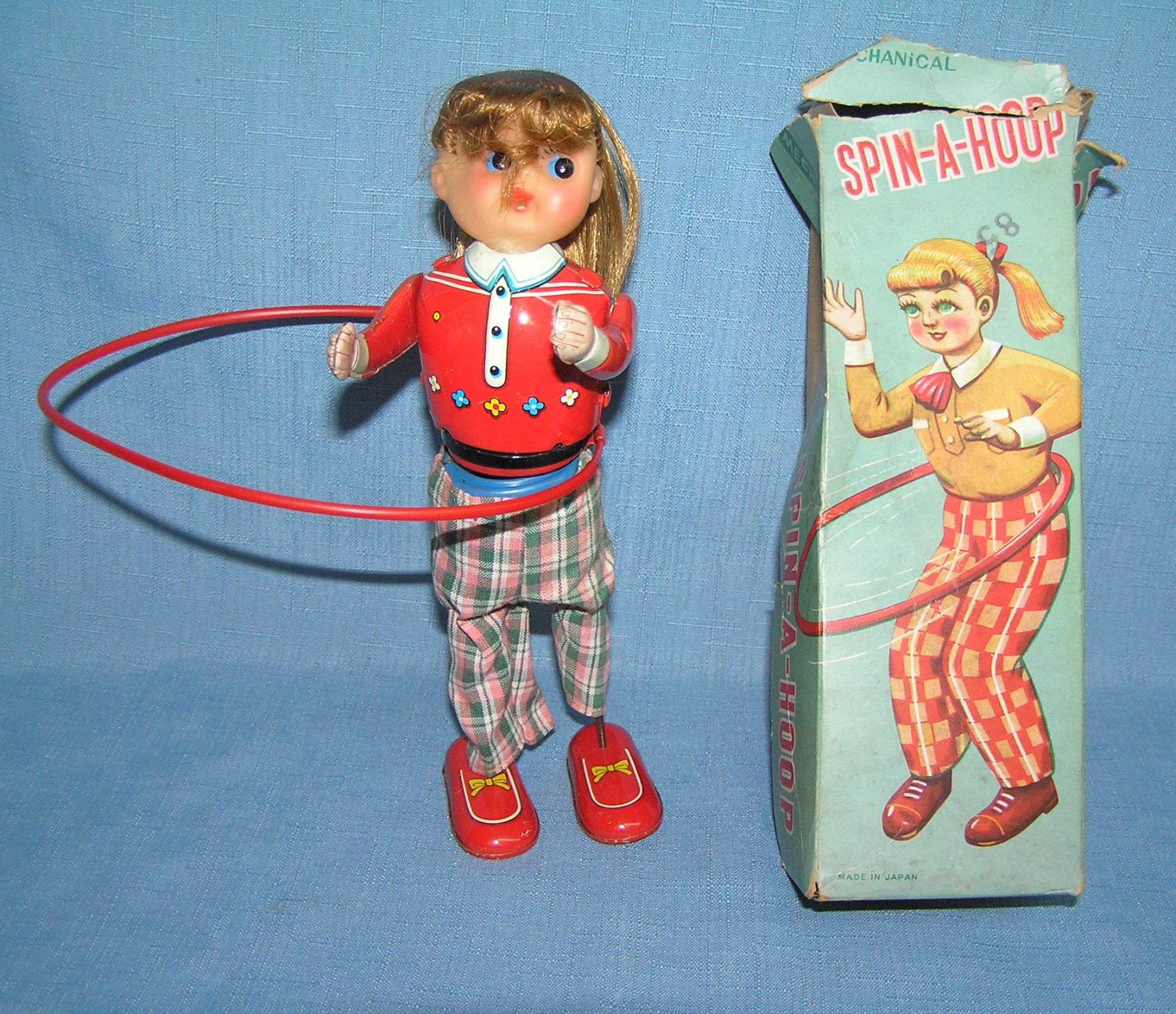 Spin-A-Hoop wind up all tin mechanical toy with original box working great, wear to upper part of original box est. value $175.00-$200.00