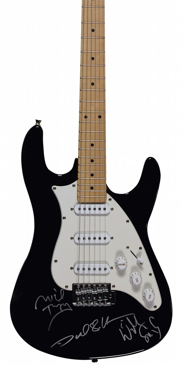 Black-bodied California ‘stratocaster-style’ electric guitar, signed on the body in silver ink by David St. Hubbins [Michael McKean], Nigel Tufnel [Christopher Guest], and Derek Smalls [Harry Shearer]. In fine condition. Oversized.
