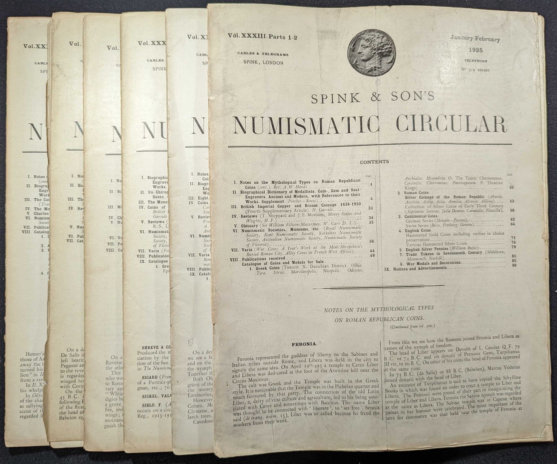 THE NUMISMATIC CIRCULAR. 1925. Spink & Son Ltd. The Numismatic Circular. Volume XXXIII. 1925: January-February, No. 1-2 to November-December, No. 11-12. Complete. 80+ pages average. original paper covers. Tall 4to. most Good to Very Good. Photo Illustrated. The longest-running numismatic house organ bar none. The Numismatic Circular is much more than a fixed price list, it published substantive articles throughout its existence, featuring many important works primarily on ancient and British coins, but also on other areas as well. Articles of interest in this volume include Notes On the Mythological Types On Roman Republican Coins by Hands; Biographical Dictionary of Medalists, Coin, Gem and Seal Engravers, Ancient and Modern, With References to Their Works by Piches & Rouw; British Imperial Copper and Bronze Coinage 1838-1920: Coins of the British Empire by Garside. Clain-Stefanelli #777. Lot weight: 2 lbs 5oz. Subject(s): Ancient, Great Britain, World Coinage, Paper Money, and Medals.