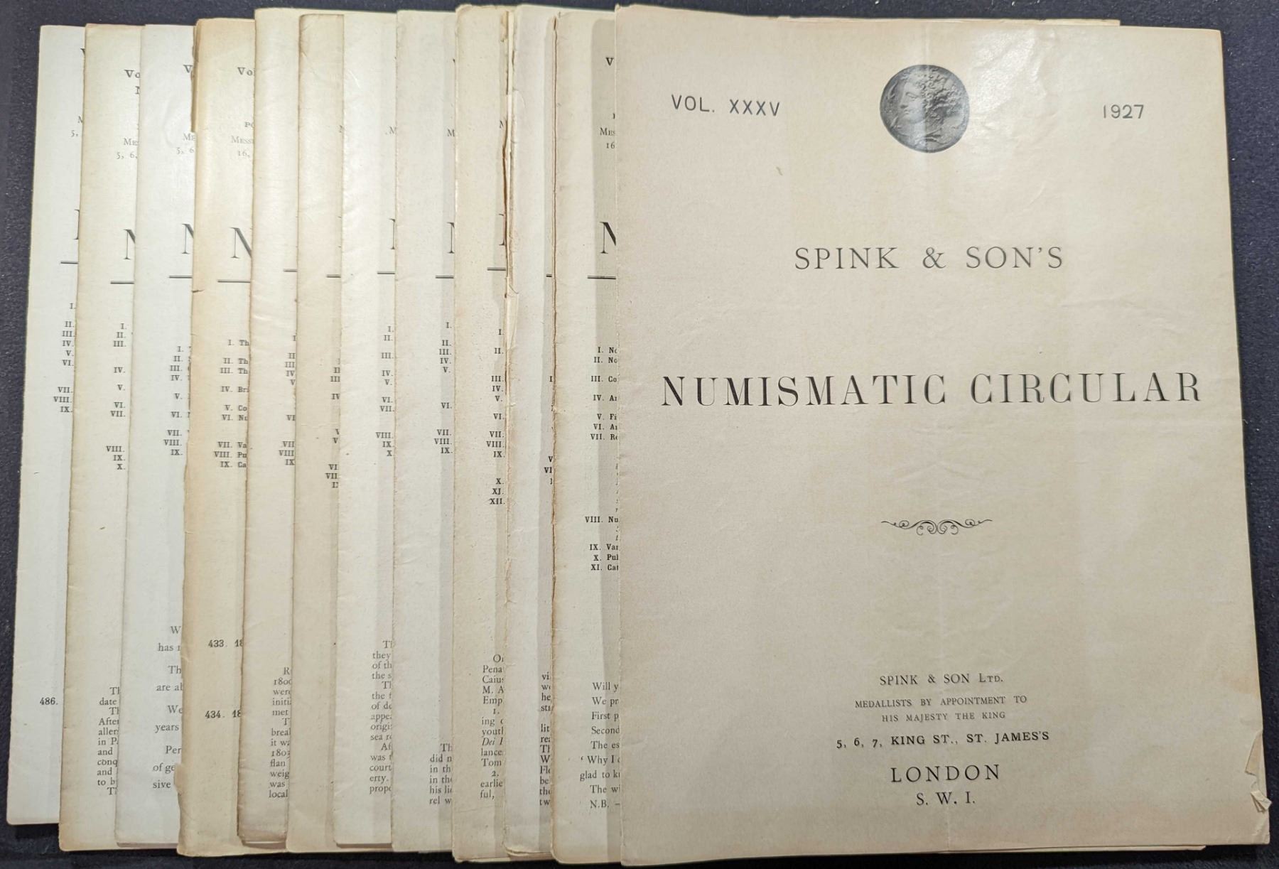 THE NUMISMATIC CIRCULAR. 1927. Spink & Son Ltd. The Numismatic Circular. Volume XXXV. 1927: January, No. 1 to December, No. 12. Complete. 70+ pages average. original paper covers. Tall 4to. most Very Good to near Fine. Photo Illustrated. The longest-running numismatic house organ bar none. The Numismatic Circular is much more than a fixed price list, it published substantive articles throughout its existence, featuring many important works primarily on ancient and British coins, but also on other areas as well. Articles of interest in this volume include Notes On the Mythological Types On Roman Republican Coins by Hands; Biographical Dictionary of Medalists, Coin, Gem and Seal Engravers, Ancient and Modern, With References to Their Works by Piches & Rouw; The Coins of the Dutch East Indies by Bucknill; The Roman Imperial Coinage Vol. II by Mattingly & Sydenham; Catalogue of the McClean Collection of Greek Coins Vol. II by Grose. Clain-Stefanelli #777. Lot weight: 2 lbs 11oz. Subject(s): Ancient, Great Britain, World Coinage, Paper Money, and Medals.
