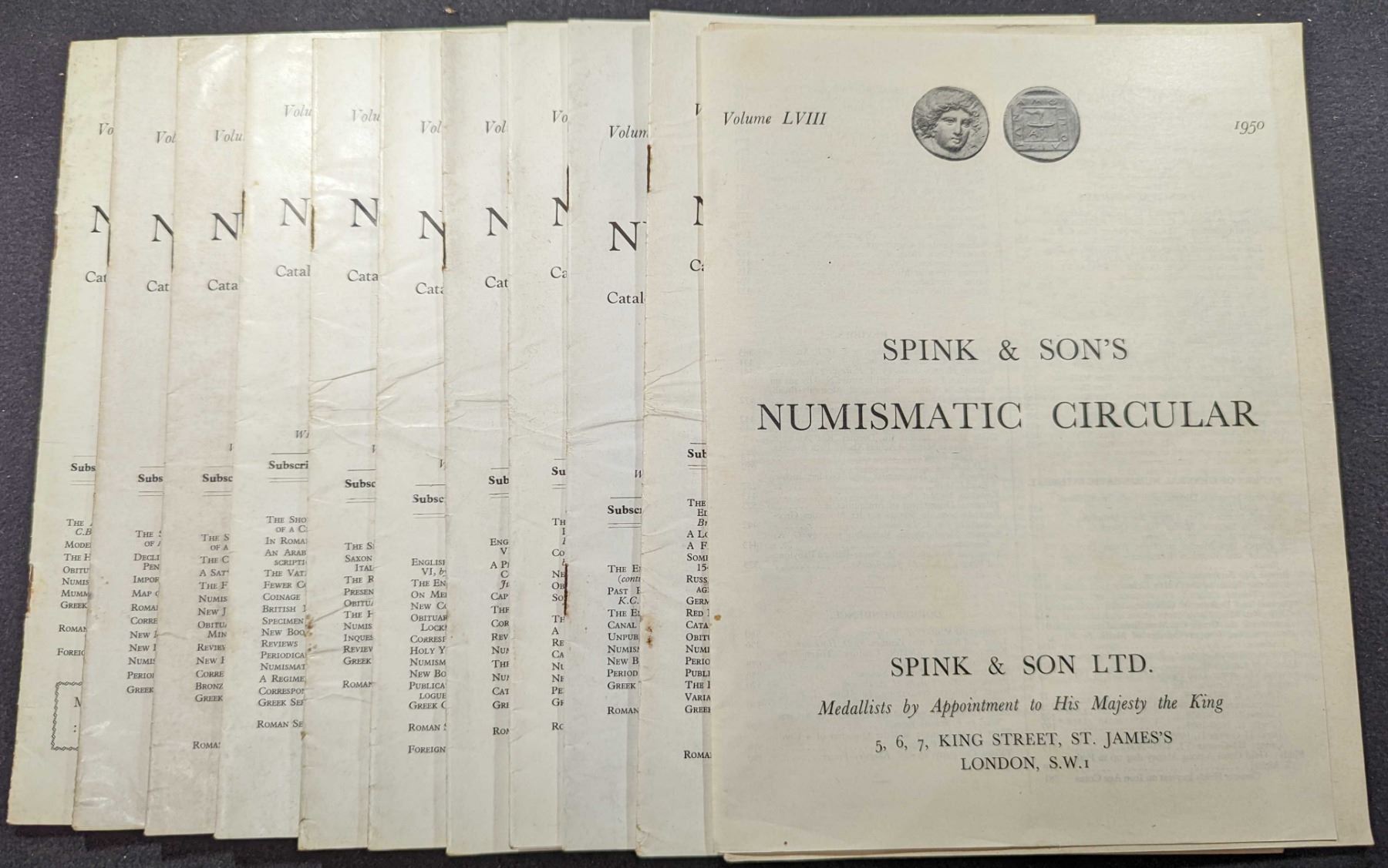 THE NUMISMATIC CIRCULAR. 1950. Spink & Son Ltd. The Numismatic Circular. Volume LVIII. 1950: January, No. 1 to December, No. 12. Complete. 24+ pages average. original paper covers. 4to. near Fine. Photo Illustrated. The longest-running numismatic house organ bar none. The Numismatic Circular is much more than a fixed price list, it published substantive articles throughout its existence, featuring many important works primarily on ancient and British coins, but also on other areas as well. Articles of interest in this volume include English Debased Silver Coinage of Edward VI by Carlyon-Britton; The Short Cross Coinage and the Question of a Civil War, AD 1215-17 by Parsons. Clain-Stefanelli #777. Lot weight: 1 lbs 6oz. Subject(s): Ancient, Great Britain, World Coinage, Paper Money, and Medals.
