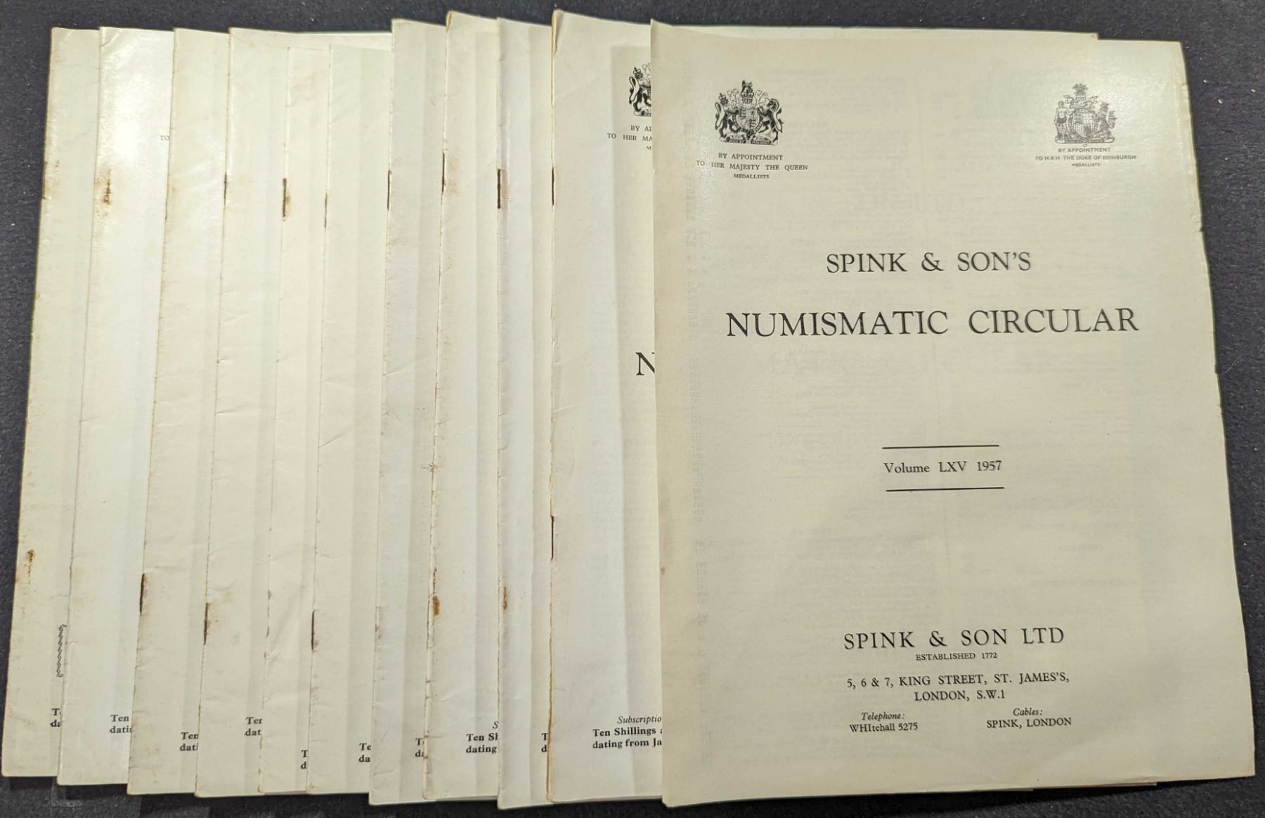 THE NUMISMATIC CIRCULAR. 1957. Spink & Son Ltd. The Numismatic Circular. Volume LXV. 1957: January, No. 1 to December, No. 12. Complete. 24+ pages average. original paper covers. 4to. most near Fine. Photo Illustrated. The longest-running numismatic house organ bar none. The Numismatic Circular is much more than a fixed price list, it published substantive articles throughout its existence, featuring many important works primarily on ancient and British coins, but also on other areas as well. Articles of interest in this volume include The Five Guinea and Two Guinea Pieces of George II by Schneider; The Coinage of South Germany in the Thirteenth Century by Metcalf; The Trade Coinage of Queen Elizabeth I by Wodak & Pridmore. Clain-Stefanelli #777. Lot weight: 1 lbs 2oz. Subject(s): Ancient, Great Britain, World Coinage, Paper Money, and Medals.