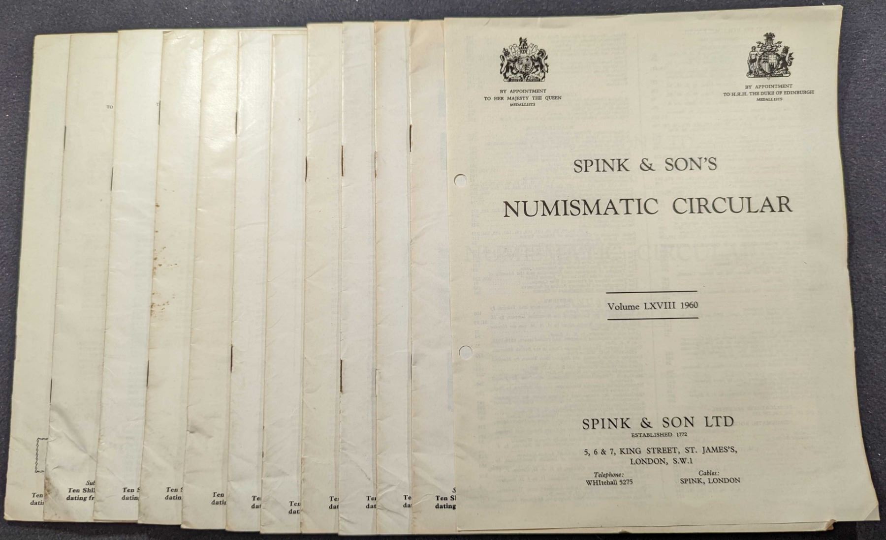 THE NUMISMATIC CIRCULAR. 1960. Spink & Son Ltd. The Numismatic Circular. Volume LXVIII. 1960: January, No. 1 to December, No. 12. Complete. 24+ pages average. original paper covers. 4to. most near Fine. Photo Illustrated. The longest-running numismatic house organ bar none. The Numismatic Circular is much more than a fixed price list, it published substantive articles throughout its existence, featuring many important works primarily on ancient and British coins, but also on other areas as well. Articles of interest in this volume include Notes on Colonial Coins: British West Indies: Dominica by Pridmore; The Coinage of South Germany in the Thirteenth Century by Metcalf; The Token Money of Prisoner of War Camps by Pridmore; Notes on Colonial Coins: Countermarked Pieces by Pridmore; Notes on Colonial Coins: The T.C. Countermark by Pridmore; Big Hoard of Tyrian Shekels Discovered on Mount Carmel by Kadman. Clain-Stefanelli #777. Lot weight: 1 lbs 1oz. Subject(s): Ancient, Great Britain, World Coinage, Paper Money, and Medals.