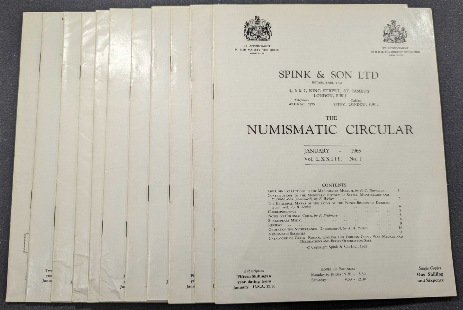 THE NUMISMATIC CIRCULAR. 1965. Spink & Son Ltd. The Numismatic Circular. Volume LXXIII. 1965: January, No. 1 to December, No. 12. Complete. 24+ pages average. original paper covers. 4to. most near Fine. Photo Illustrated. The longest-running numismatic house organ bar none. The Numismatic Circular is much more than a fixed price list, it published substantive articles throughout its existence, featuring many important works primarily on ancient and British coins, but also on other areas as well. Articles of interest in this volume include The Coinage of the British Caribbean Territories 1955-1964: The Coinage of the Gold Coast 1796-1818 by Remick; The Lusitania Medal by Fearon; Four Important Roman Imperial Sestertii: Trajan, Hadrian, and Septimus Severus by Vermeule. Clain-Stefanelli #777. Lot weight: 1 lbs 2oz. Subject(s): Ancient, Great Britain, World Coinage, Paper Money, and Medals.