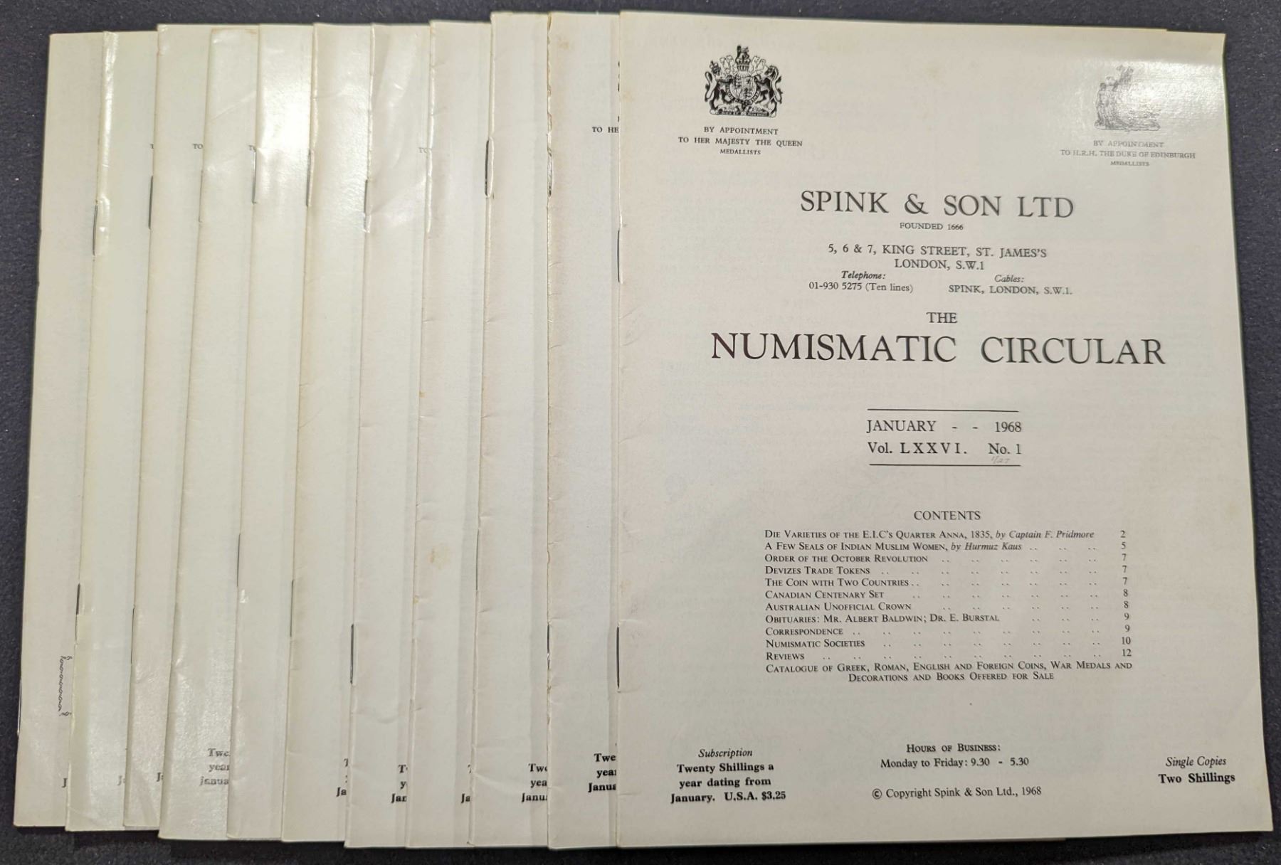 THE NUMISMATIC CIRCULAR. 1968. Spink & Son Ltd. The Numismatic Circular. Volume LXXVI. 1968: January, No. 1 to December, No. 12. Complete. 24+ pages average. original paper covers. 4to. most near Fine. Photo Illustrated. The longest-running numismatic house organ bar none. The Numismatic Circular is much more than a fixed price list, it published substantive articles throughout its existence, featuring many important works primarily on ancient and British coins, but also on other areas as well. Articles of interest in this volume include The Destruction of the Spanish Silver Fleet at Vigo in 1702 by Kamen; The Vergulde Draek by Boxer; A Late VIIth Century Hoard by Whitting; A Currently Emerging Parthian Hoard by Sellwood. Clain-Stefanelli #777. Lot weight: 1 lbs 10oz. Subject(s): Ancient, Great Britain, World Coinage, Paper Money, and Medals.