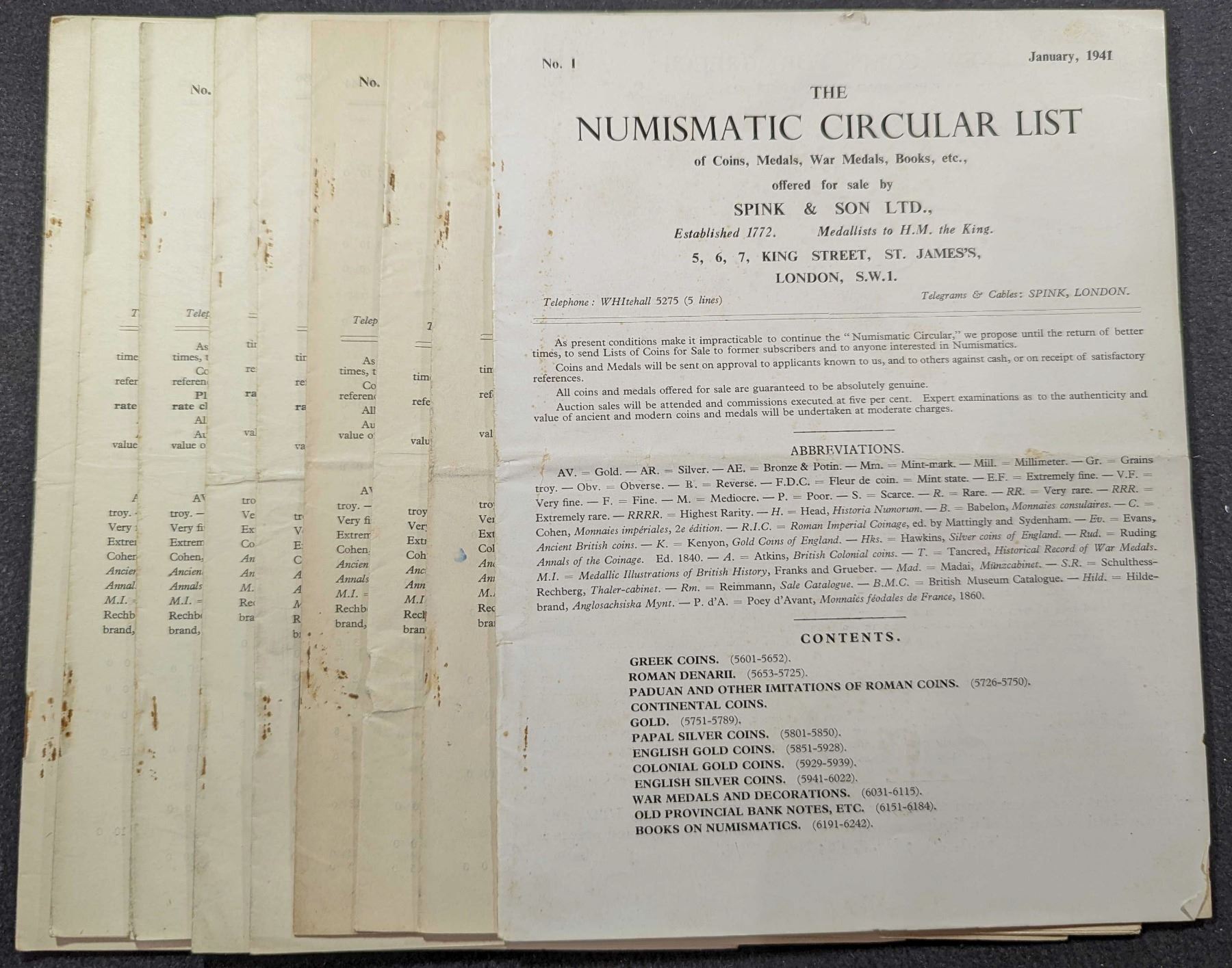 THE NUMISMATIC CIRCULAR LIST. 1941. Spink & Son Ltd. The Numismatic Circular List. Volume XLIX. 1941: January, No. 1 to December, No. 12. Missing numbers 5 & 6. 24+ pages average. original paper covers. 4to. near Fine. The longest-running numismatic house organ bar none. The Numismatic Circular is much more than a fixed price list, it published substantive articles throughout its existence, featuring many important works primarily on ancient and British coins, but also on other areas as well. During the war years (Volume XLVIII:1940 to Volume LIII:1945) the Numismatic Circular became the Numismatic Circular List and was used only as a fixed price list. The limited inclusion of articles resumed with the later months of Volume LIII:1945 and was back to the Numismatic Circular starting with Volume LV No. 6:1947. Clain-Stefanelli #777. Lot weight: 0 lbs 7oz. Subject(s): Ancient, Great Britain, World Coinage, Paper Money, and Medals.