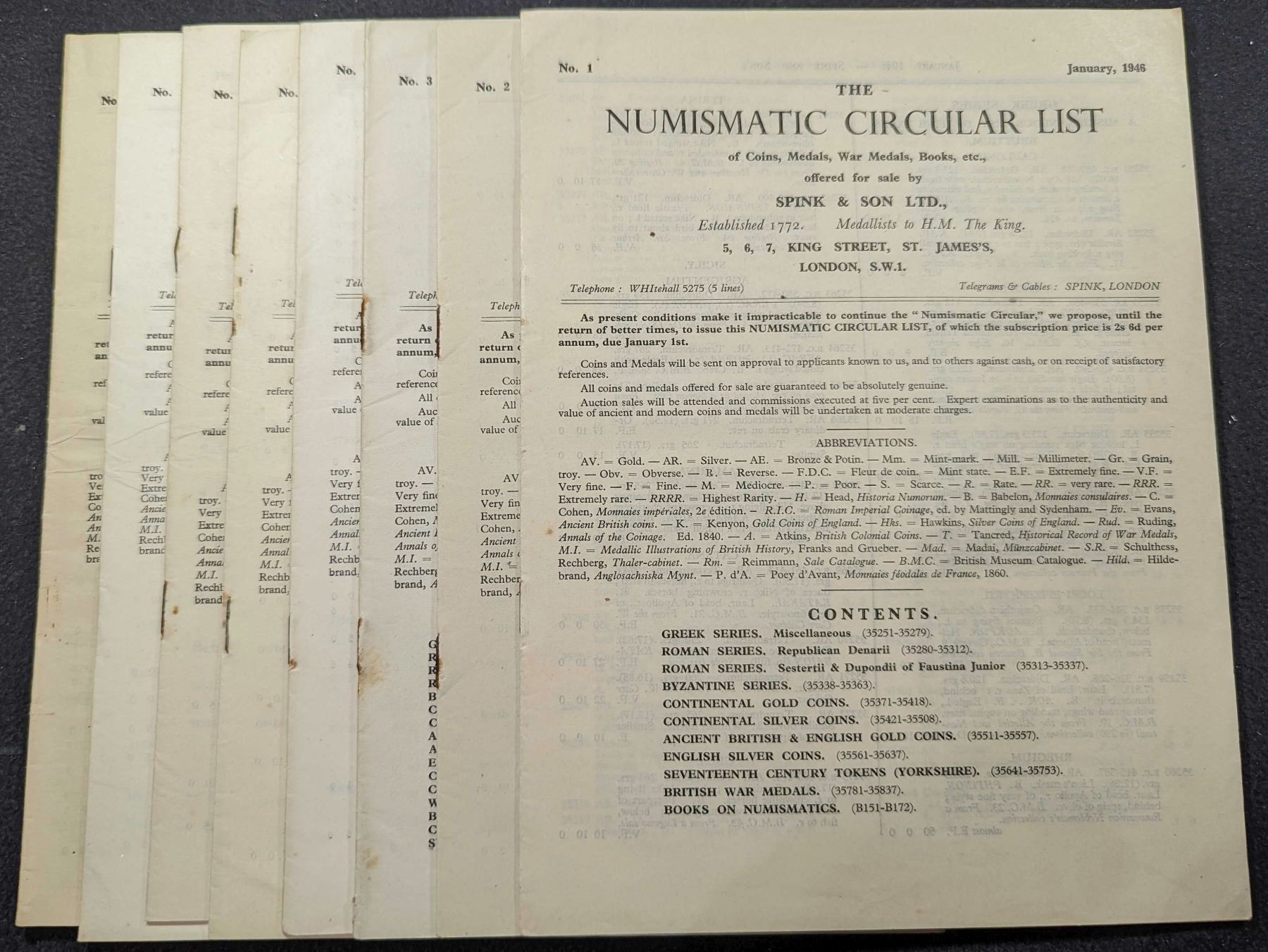 THE NUMISMATIC CIRCULAR LIST. 1946. Spink & Son Ltd. The Numismatic Circular List. Volume LIV. 1946: January, No. 1 to November, No. 11. Missing numbers 7-9, 12. 24+ pages average. original paper covers. 4to. near Fine. The longest-running numismatic house organ bar none. The Numismatic Circular is much more than a fixed price list, it published substantive articles throughout its existence, featuring many important works primarily on ancient and British coins, but also on other areas as well. During the war years (Volume XLVIII:1940 to Volume LIII:1945) the Numismatic Circular became the Numismatic Circular List and was used only as a fixed price list. The limited inclusion of articles resumed with the later months of Volume LIII:1945 and was back to the Numismatic Circular starting with Volume LV No. 6:1947. Clain-Stefanelli #777. Lot weight: 0 lbs 8oz. Subject(s): Ancient, Great Britain, World Coinage, Paper Money, and Medals.