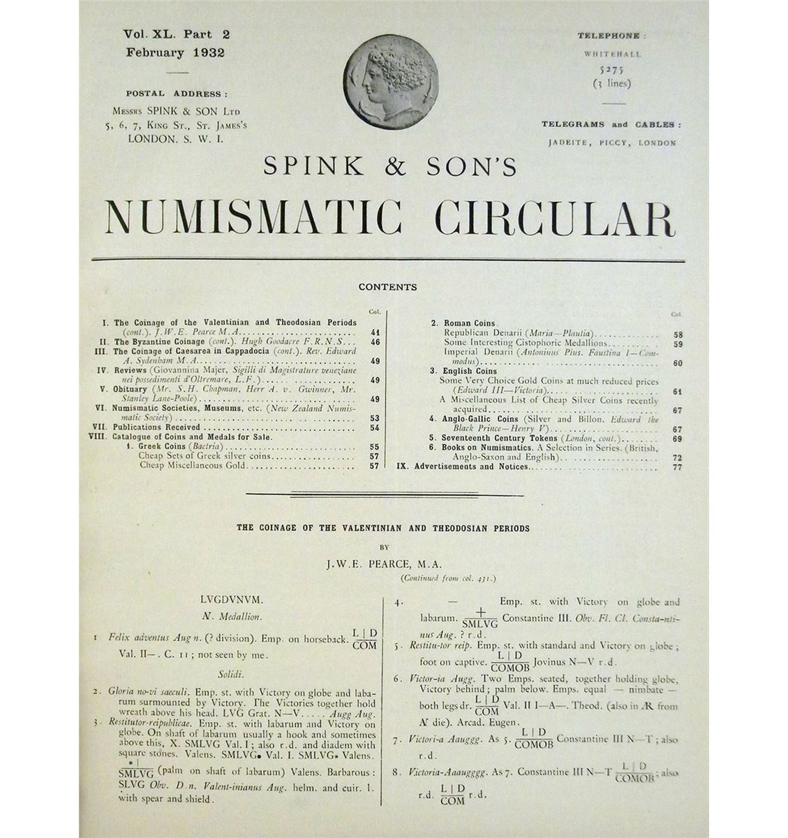 Spink & Son. SPINK & SON'S MONTHLY NUMISMATIC CIRCULAR. Vol. XL (1938). Tall 4to, crimson cloth, gilt. (8), (212) pages; illustrated. Issues folded from mailing; near fine. Includes articles by Goodacre on Byzantium, Sydenham on Caesarea in Cappadocia, and so on. Manville 695. Clain-Stefanelli 777.