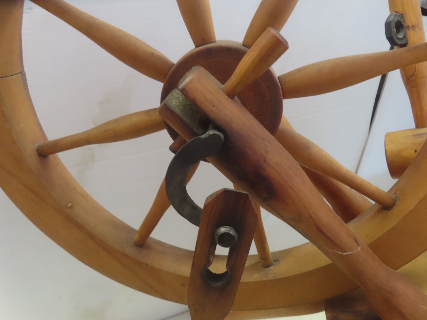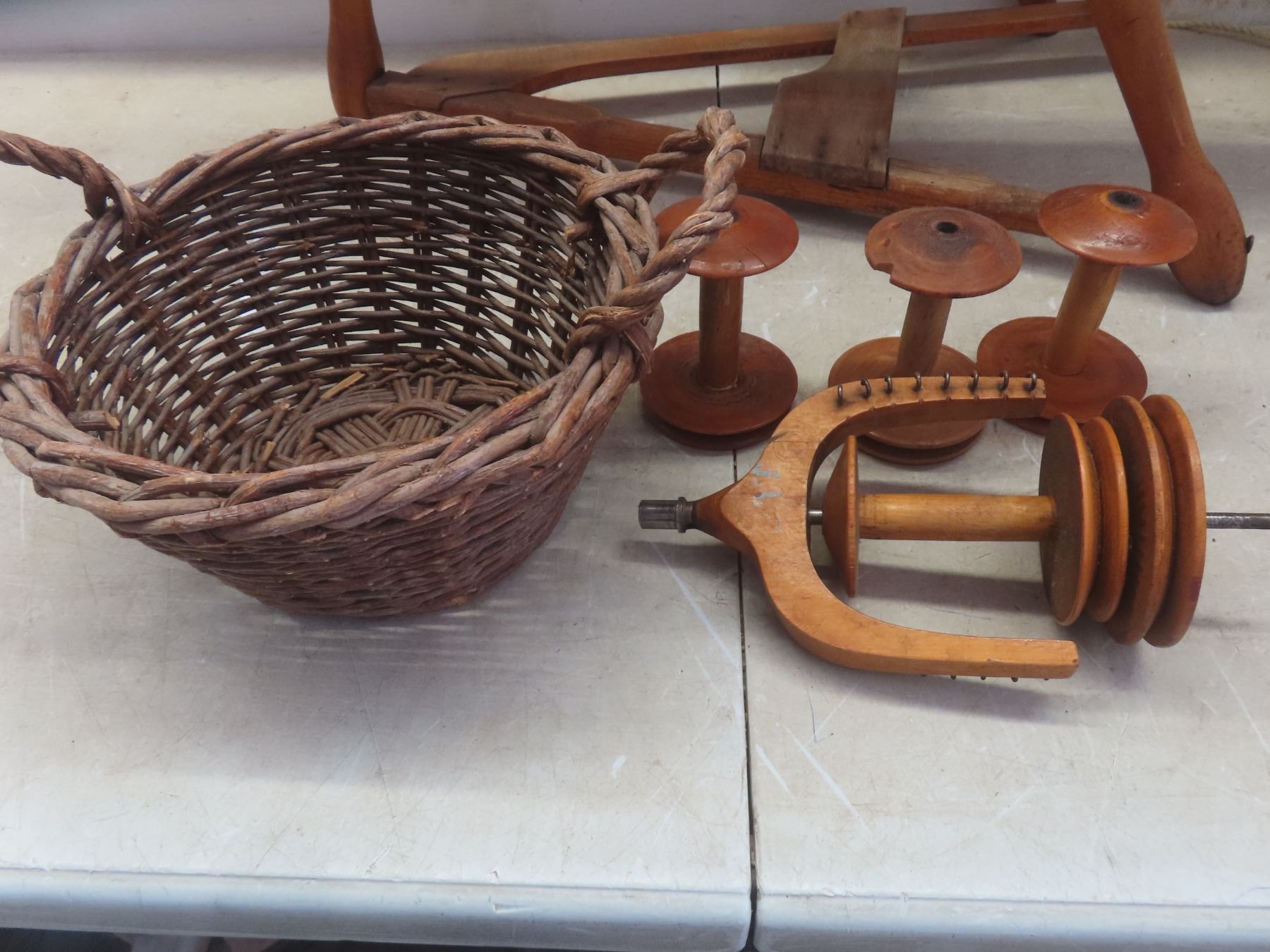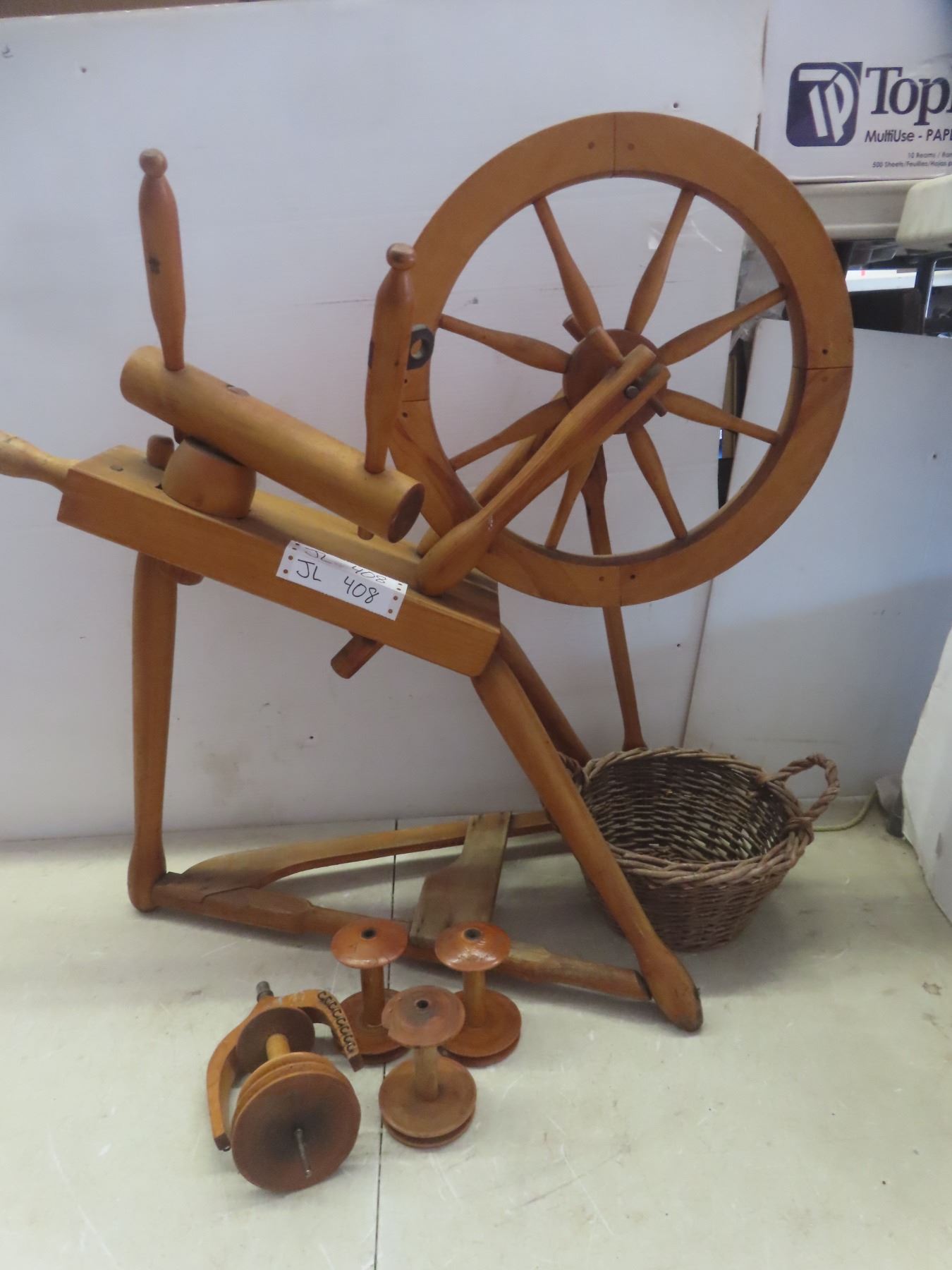 Spinning Wheel with 4 Bobbins in Willow Basket