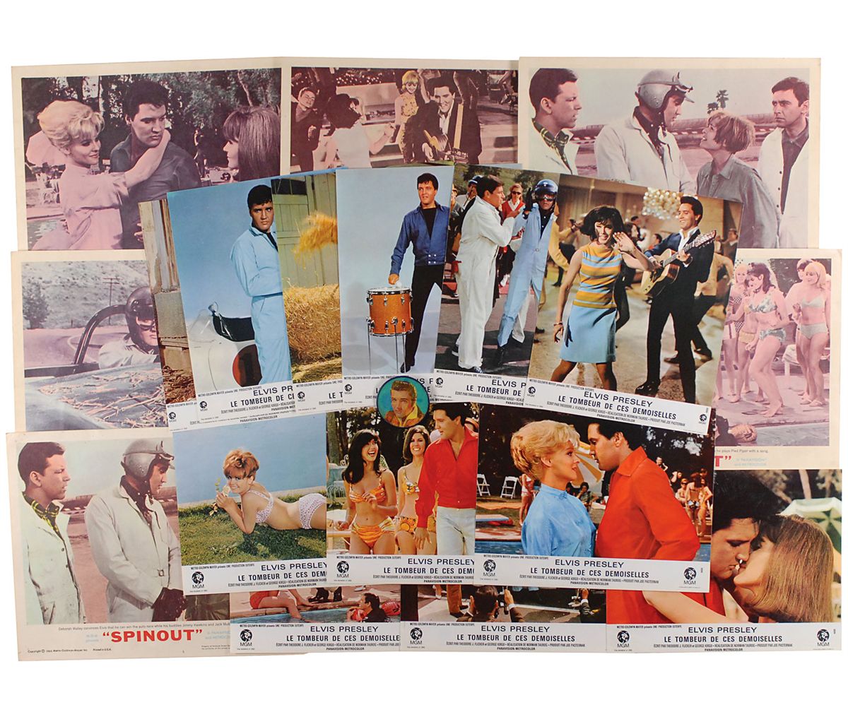 Collection of promotional material for Presley’s 1966 film Spinout, consisting of seven color 14 x 11 lobby cards and two different sets of six color 11 x 8.5 and 8.5 x 11 magazine-stock French photos for Le tombeur de ces dames [Spinout]. Also included is a vintage color 2.5? diameter hologram pin, with a 1959 Elvis Presley Enterprises copyright stamp on the reverse. In overall fine condition, with various creases and tack holes to lobby cards. Both sets of photos are accompanied by their original envelopes.