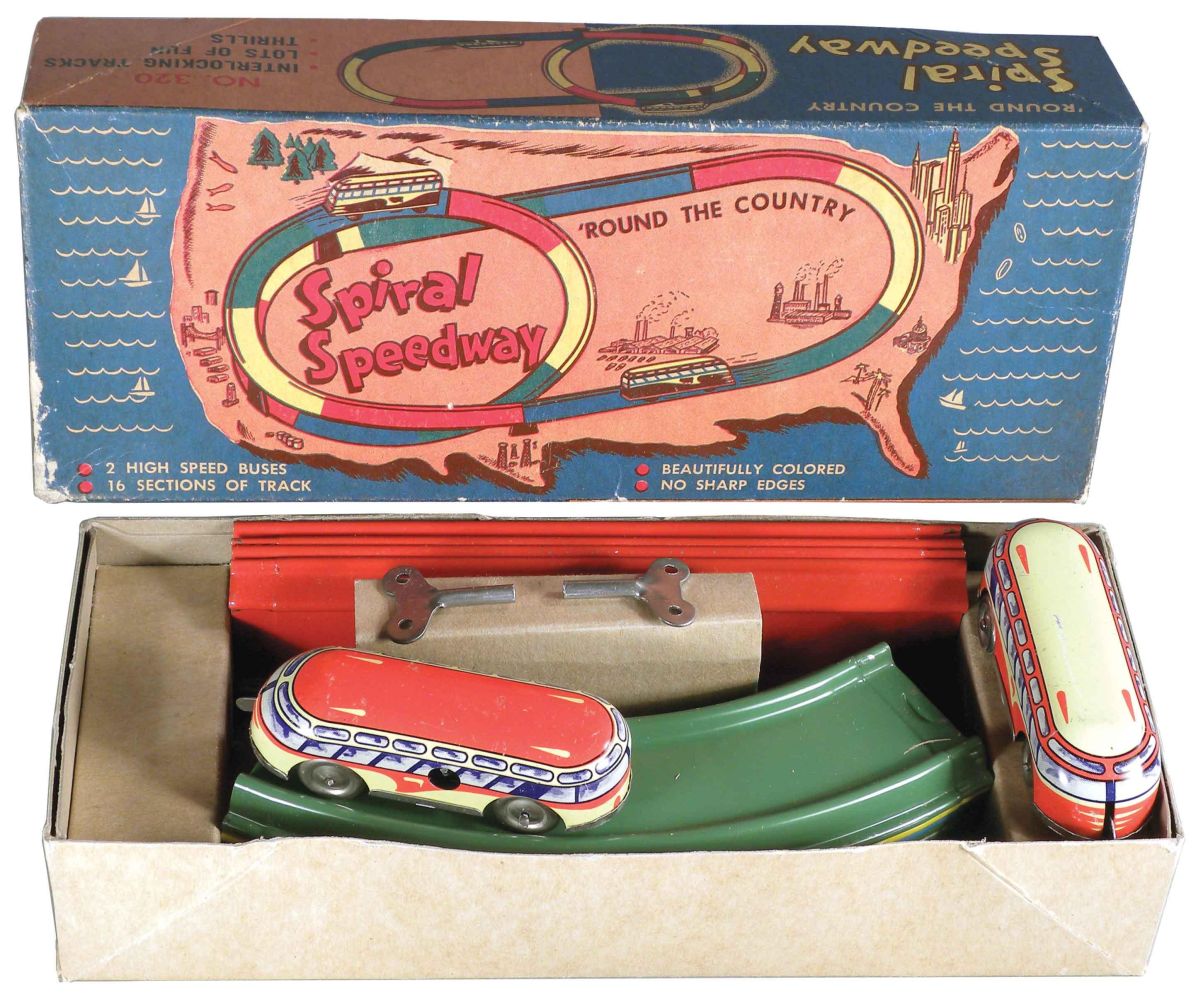 Spiral Speedway Toy #20, in original box. Automatic Toy Company, Staten Island, NY. Like new condition. 10 1/2 X 2 1/4 X 4 1/4 box measurement. Start Price $40