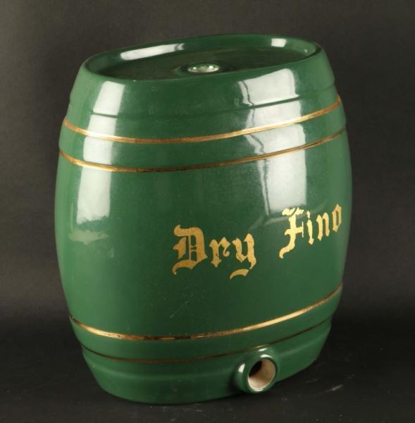 English Mid 19th Century. Hunter green ceramic barrel with gilt trim and "Dry "Fino" in gold. Measures approx. 10"l x 6"w x 12"h. "Royal Norfolk" with crown stamp on bottom. Good condition.