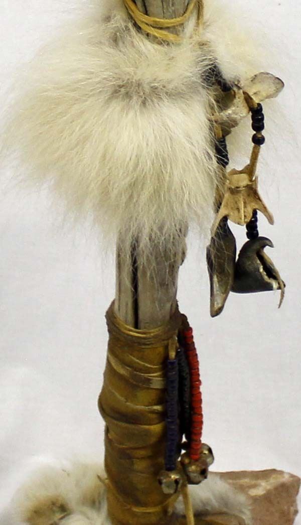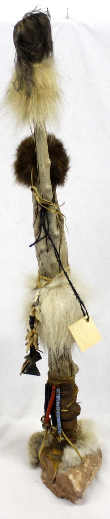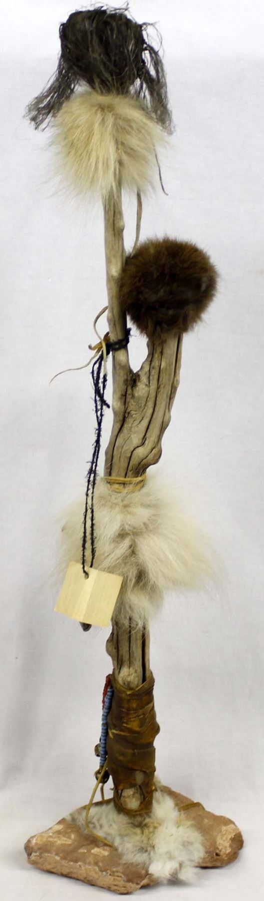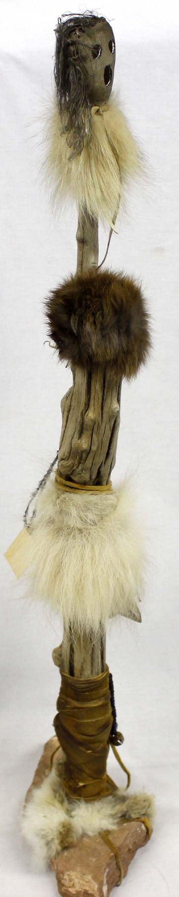 Spirit Chaser by Master Hunter, measures 36''H x 9.75''W x 6''D, weighs about 6 lbs., wood limb wrapped in leather on a sandstone base, embellished with buffalo fur, coyote fur, pony beads, old trade beads, brass bells, deer hooves, scrotum sac on the top (with cutout face in the hide), and coyote vertebrae, possibly used as a trail marker