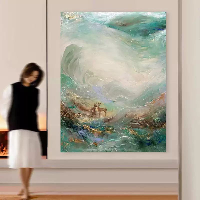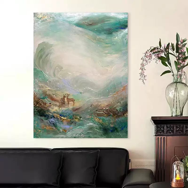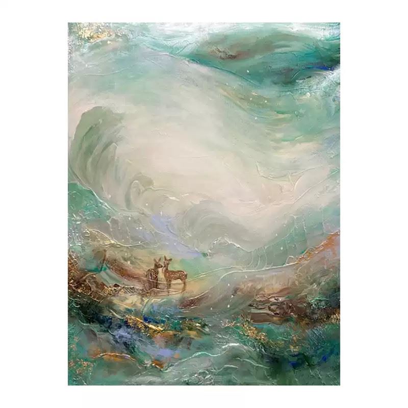 In this dreamlike scene, mist swirls around two ethereal deer gracefully moving through the meadow, seemingly one with nature. The soft hues of pale green, gold, and ivory resemble the gentle glow of dawn, radiating a mysterious aura that evokes a sense of tranquility and spiritual escape. Dimensions: 24 x 31 inches.
